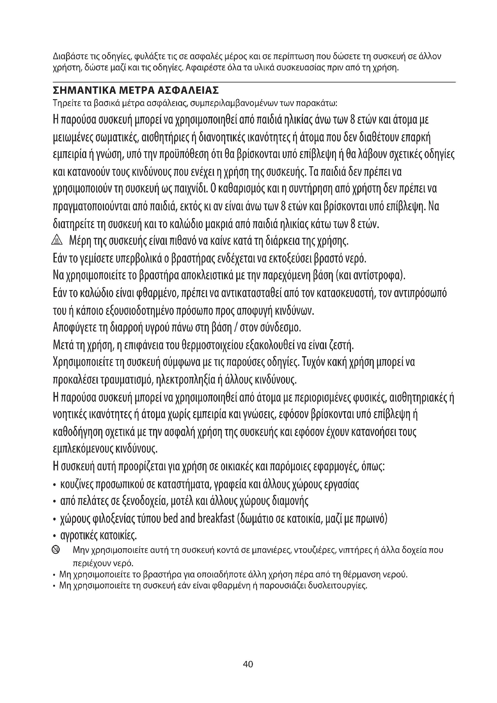 Τηρείτε τα βασικά μέτρα ασφάλειας, συμπεριλαμβανομένων των παρακάτω: Η παρούσα συσκευή μπορεί να χρησιμοποιηθεί από παιδιά ηλικίας άνω των 8 ετών και άτομα με μειωμένες σωματικές, αισθητήριες ή διανοητικές ικανότητες ή άτομα που δεν διαθέτουν επαρκή εμπειρία ή γνώση, υπό την προϋπόθεση ότι θα βρίσκονται υπό επίβλεψη ή θα λάβουν σχετικές οδηγίες και κατανοούν τους κινδύνους που ενέχει η χρήση της συσκευής. Τα παιδιά δεν πρέπει να χρησιμοποιούν τη συσκευή ως παιχνίδι. Ο καθαρισμός και η συντήρηση από χρήστη δεν πρέπει να πραγματοποιούνται από παιδιά, εκτός κι αν είναι άνω των 8 ετών και βρίσκονται υπό επίβλεψη. Να διατηρείτε τη συσκευή και το καλώδιο μακριά από παιδιά ηλικίας κάτω των 8 ετών. h Μέρη της συσκευής είναι πιθανό να καίνε κατά τη διάρκεια της χρήσης. Εάν το γεμίσετε υπερβολικά ο βραστήρας ενδέχεται να εκτοξεύσει βραστό νερό. Να χρησιμοποιείτε το βραστήρα αποκλειστικά με την παρεχόμενη βάση (και αντίστροφα). Εάν το καλώδιο είναι φθαρμένο, πρέπει να αντικατασταθεί από τον κατασκευαστή, τον αντιπρόσωπό του ή κάποιο εξουσιοδοτημένο πρόσωπο προς αποφυγή κινδύνων. Αποφύγετε τη διαρροή υγρού πάνω στη βάση / στον σύνδεσμο. Μετά τη χρήση, η επιφάνεια του θερμοστοιχείου εξακολουθεί να είναι ζεστή. Χρησιμοποιείτε τη συσκευή σύμφωνα με τις παρούσες οδηγίες. Τυχόν κακή χρήση μπορεί να προκαλέσει τραυματισμό, ηλεκτροπληξία ή άλλους κινδύνους. Η παρούσα συσκευή μπορεί να χρησιμοποιηθεί από άτομα με περιορισμένες φυσικές, αισθητηριακές ή νοητικές ικανότητες ή άτομα χωρίς εμπειρία και γνώσεις, εφόσον βρίσκονται υπό επίβλεψη ή καθοδήγηση σχετικά με την ασφαλή χρήση της συσκευής και εφόσον έχουν κατανοήσει τους εμπλεκόμενους κινδύνους. Η συσκευή αυτή προορίζεται για χρήση σε οικιακές και παρόμοιες εφαρμογές, όπως: