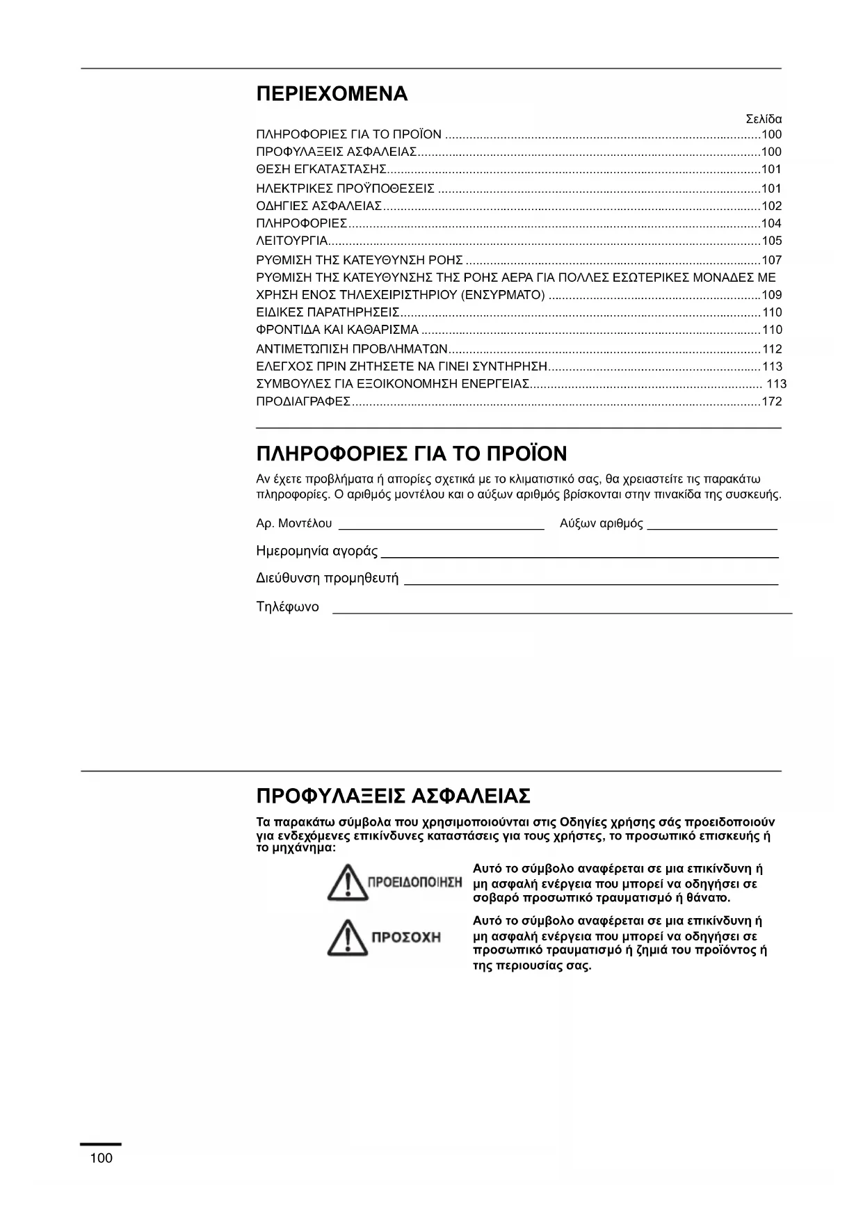 - ΠΡΟΔΙΑΓΡΑΦΕΣ ΠΛΗΡΟΦΟΡΙΕΣ ΓΙΑ ΤΟ ΠΡΟΪΟΝ Αν έχετε προβλήματα ή απορίες σχετικά με το κλιματιστικό σας, θα χρειαστείτε τις παρακάτω πληροφορίες. Ο αριθμός μοντέλου και ο αύξων αριθμός βρίσκονται στην πινακίδα της συσκευής. Αρ. Μοντέλου ______________________________ Αύξων αριθμός ___________________ Ημερομηνία αγοράς ____________________________________________________ Διεύθυνση προμηθευτή _________________________________________________ Τηλέφωνο ____________________________________________________________ ΠΡΟΦΥΛΑΞΕΙΣ ΑΣΦΑΛΕΙΑΣ Τα παρακάτω σύμβολα που χρησιμοποιούνται στις Οδηγίες χρήσης σάς προειδοποιούν για ενδεχόμενες επικίνδυνες καταστάσεις για τους χρήστες, το προσωπικό επισκευής ή το μηχάνημα: Αυτό το σύμβολο αναφέρεται σε μια επικίνδυνη ή μη ασφαλή ενέργεια που μπορεί να οδηγήσει σε σοβαρό προσωπικό τραυματισμό ή θάνατο. Αυτό το σύμβολο αναφέρεται σε μια επικίνδυνη p. 172