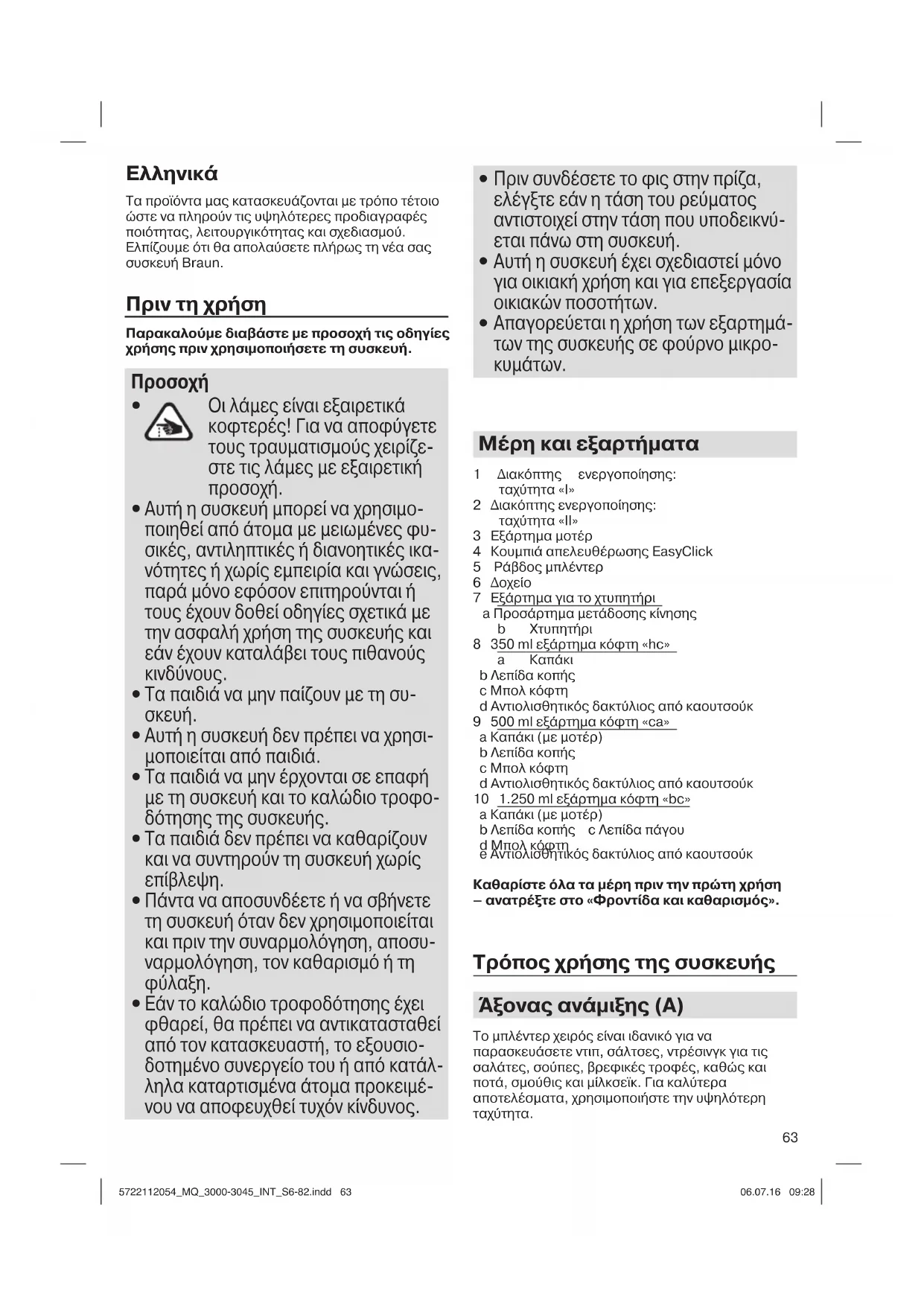 - Κατά την επεξεργασία τροφίμων με υψηλή περιεκτικότητα σε χρωστικές (π.χ. καρότα) τα εξαρτήματα ενδέχεται να αποχρωματιστούν. Σκουπίστε αυτά τα μέρη με φυτικό λάδι πριν τα καθαρίσετε. Τόσο οι προδιαγραφές σχεδιασμού όσο και αυτές οι οδηγίες χρήστης υπόκεινται σε αλλαγές χωρίς προειδοποίηση. Υπόκειται σε αλλαγές χωρίς ειδοποίηση. Μην πετάτε το προϊόν στα οικιακά απορρίμματα μετά το τέλος του κύκλου ζωής του. Μπορείτε να το παραδώσετε στο κέντρο σέρβις της Braun ή στα σημεία συλλογής της χώρας σας. Τα υλικά και τα αντικείμενα που προορίζονται να έρθουν σε επαφή με τρόφιμα συμμορφώνονται με τις διατάξεις του Ευρωπαϊκού Κανονισμού 1935/2004. 5722112054_MQ_3000-3045_INT_S6-82.indd 655722112054_MQ_3000-3045_INT_S6-82.indd 65 06.07.16 09:2806.07.16 09:2866