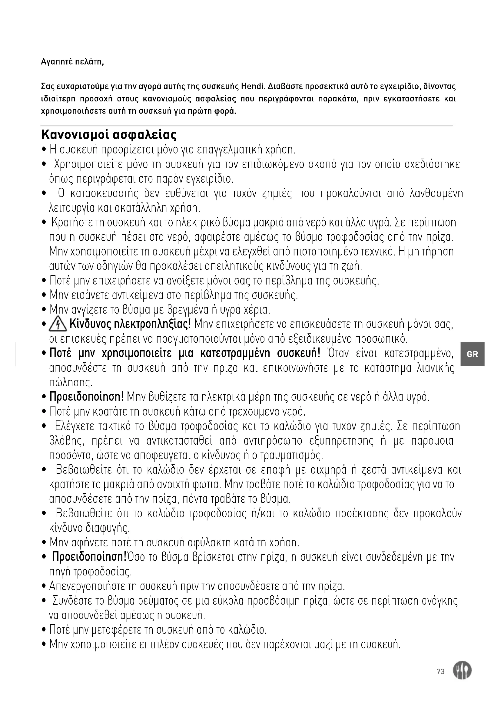 Αγαπητέ πελάτη, Σας ευχαριστούμε για την αγορά αυτής της συσκευής Hendi. Διαβάστε προσεκτικά αυτό το εγχειρίδιο, δίνοντας ιδιαίτερη προσοχή στους κανονισμούς ασφαλείας που περιγράφονται παρακάτω, πριν εγκαταστήσετε και χρησιμοποιήσετε αυτή τη συσκευή για πρώτη φορά. Κανονισμοί ασφαλείας