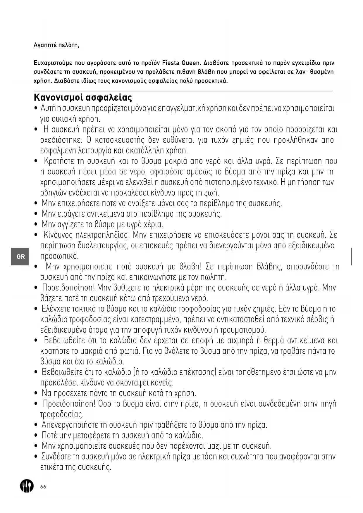 Αγαπητέ πελάτη, Ευχαριστούμε που αγοράσατε αυτό το προϊόν Fiesta Queen. Διαβάστε προσεκτικά το παρόν εγχειρίδιο πριν συνδέσετε τη συσκευή, προκειμένου να προλάβετε πιθανή βλάβη που μπορεί να οφείλεται σε λαν- θασμένη χρήση. Διαβάστε ιδίως τους κανονισμούς ασφαλείας πολύ προσεκτικά. Κανονισμοί ασφαλείας