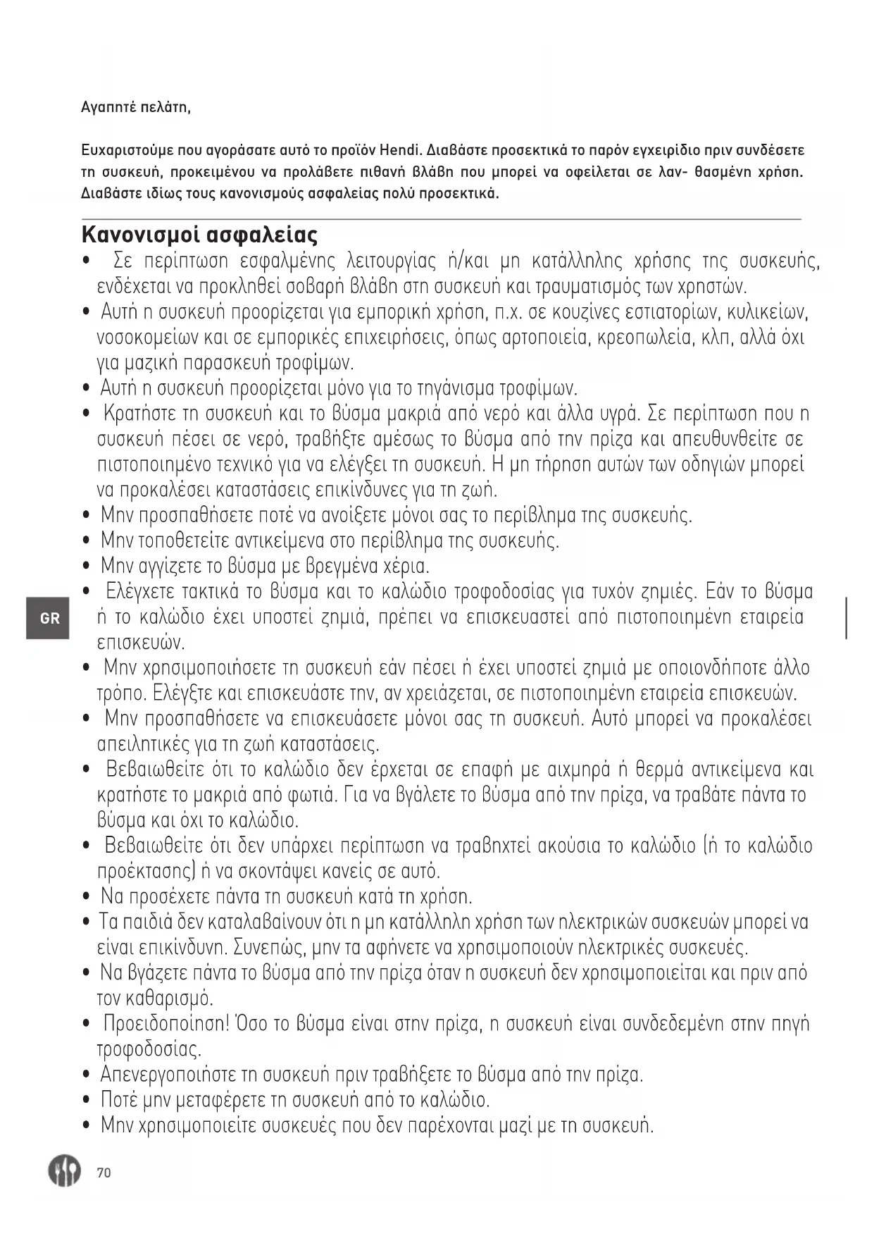 Αγαπητέ πελάτη, Ευχαριστούμε που αγοράσατε αυτό το προϊόν Hendi. Διαβάστε προσεκτικά το παρόν εγχειρίδιο πριν συνδέσετε τη συσκευή, προκειμένου να προλάβετε πιθανή βλάβη που μπορεί να οφείλεται σε λαν- θασμένη χρήση. Διαβάστε ιδίως τους κανονισμούς ασφαλείας πολύ προσεκτικά. Κανονισμοί ασφαλείας