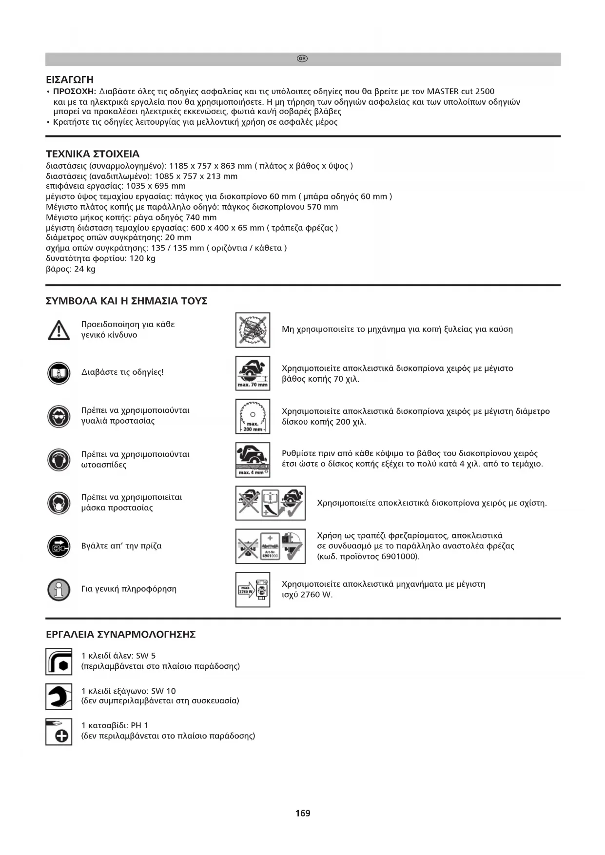 ΕΡΓΑΛΕΙΑ ΣΥΝΑΡΜΟΛΟΓΗΣΗΣ 1 κλειδί άλεν: SW 5 (περιλαβάνεται στο πλαίσιο παράδοσης) 1 κατσαβίδι: PH 1 (δεν περιλαβάνεται στο πλαίσιο παράδοσης) 1 κλειδί εξάγωνο: SW 10 (δεν συµπεριλαµβάνεται στη συσκευασία) BDAL 6902_116306902 26.04.17 11:51 Seite 169170 ΠΡΟΒΛΕΠΟΜΕΝΗ ΧΡΗΣΗ Το MASTER cut 2500 είναι ένας ακριβής πάγκος κοπής και εργασίας. Είναι κατάλληλος για: