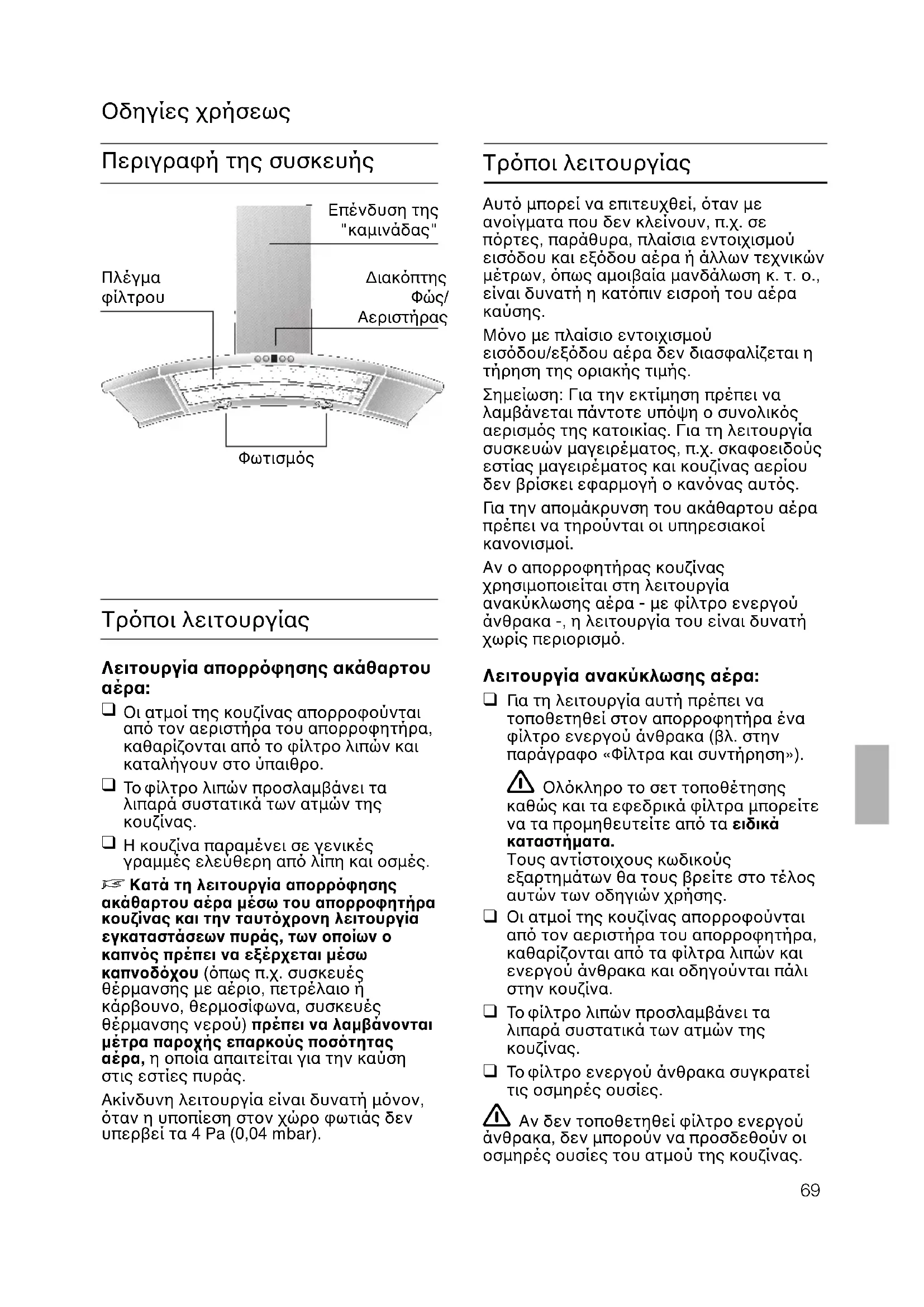 Κατά τη λειτουργία απορρφησης ακάθαρτου αέρα µέσω του απορροφητήρα κουζίνας και την ταυτχρονη λειτουργία εγκαταστάσεων πυράς, των οποίων ο καπνς πρέπει να εξέρχεται µέσω καπνοδχου (πως π.χ. συσκευές θέρµανσης µε αέριο, πετρέλαιο ή κάρβουνο, θερµοσίφωνα, συσκευές θέρµανσης νερού) πρέπει να λαµβάνονται µέτρα παροχής επαρκούς ποστητας αέρα, η οποία απαιτείται για την καύση στις εστίες πυράς. Ακίνδυνη λειτουργία είναι δυνατή µνον, ταν η υποπίεση στον χώρο φωτιάς δεν υπερβεί τα 4 Pa (0,04 mbar). Αυτ µπορεί να επιτευχθεί, ταν χάρη σε ανοίγµατα που δεν κλείνουν, π.χ. σε πρτες, παράθυρα και σε συνδυασµ µε πλαίσιο εντοιχισµού εισδου/εξδου αέρα ή χάρη σε άλλα τεχνικά µέτρα, πως αµοιβαία ασφάλιση ή παρµοια, ο αέρας καύσης µπορεί να εισρέει κατπιν ανεµπδιστα. Σε µη επαρκή αέρα παροχής υφίσταται κίνδυνος δηλητηρίασης απ επαναρροφώµενα αέρια καύσης. Μνο µε πλαίσιο εντοιχισµού εισδου/εξδου αέρα δεν διασφαλίζεται η τήρηση της οριακής τιµής. Σηµείωση: Για την εκτίµηση πρέπει να λαµβάνεται πάντοτε υπψη ο συνολικς αερισµς της κατοικίας. Για τη λειτουργία συσκευών µαγειρέµατος, π.χ. σκαφοειδούς εστίας µαγειρέµατος και κουζίνας αερίου δεν βρίσκει εφαρµογή ο καννας αυτς. Αν ο απορροφητήρας κουζίνας χρησιµοποιείται στη λειτουργία ανακύκλωσης αέρα - µε φίλτρο ενεργού άνθρακα -, η λειτουργία του είναι δυνατή χωρίς περιορισµ. Σε περίπτωση που ο ακάθαρτος αέρας εξέρχεται δια του εξωτερικού τοίχου, πρέπει να χρησιµοποιείται πλαίσιο εντοιχισµού τηλεσκοπικού τύπου. Λειτουργία απορρφησης ακάθαρτου