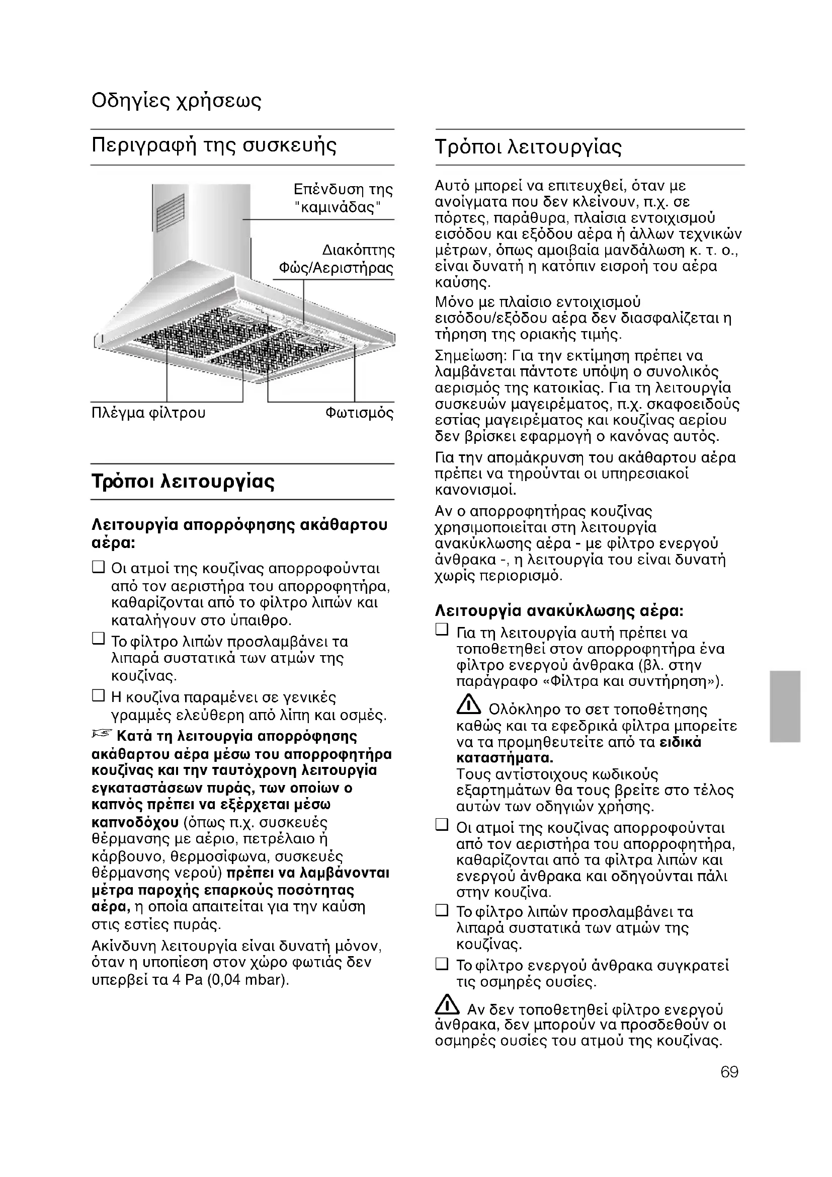 Τρποι λειτουργίας Αυτ µπορεί να επιτευχθεί, ταν µεανοίγµατα που δεν κλείνουν, π.χ. σεπρτες, παράθυρα, πλαίσια εντοιχισµούεισδου και εξδου αέρα ή άλλων τεχνικώνµέτρων, πως αµοιβαία µανδάλωση κ. τ. ο.,είναι δυνατή η κατπιν εισροή του αέρακαύσης.Μνο µε πλαίσιο εντοιχισµούεισδου/εξδου αέρα δεν διασφαλίζεται ητήρηση της οριακής τιµής.Σηµείωση: Για την εκτίµηση πρέπει ναλαµβάνεται πάντοτε υπψη ο συνολικςαερισµς της κατοικίας. Για τη λειτουργίασυσκευών µαγειρέµατος, π.χ. σκαφοειδούςεστίας µαγειρέµατος και κουζίνας αερίουδεν βρίσκει εφαρµογή ο καννας αυτς.Γι α την αποµάκρυνση του ακάθαρτου αέραπρέπει να τηρούνται οι υπηρεσιακοίκανονισµοί.Αν ο απορροφητήρας κουζίναςχρησιµοποιείται στη λειτουργίαανακύκλωσης αέρα - µε φίλτρο ενεργούάνθρακα -, η λειτουργία του είναι δυνατήχωρίς περιορισµ. Λειτουργία ανακύκλωσης αέρα: