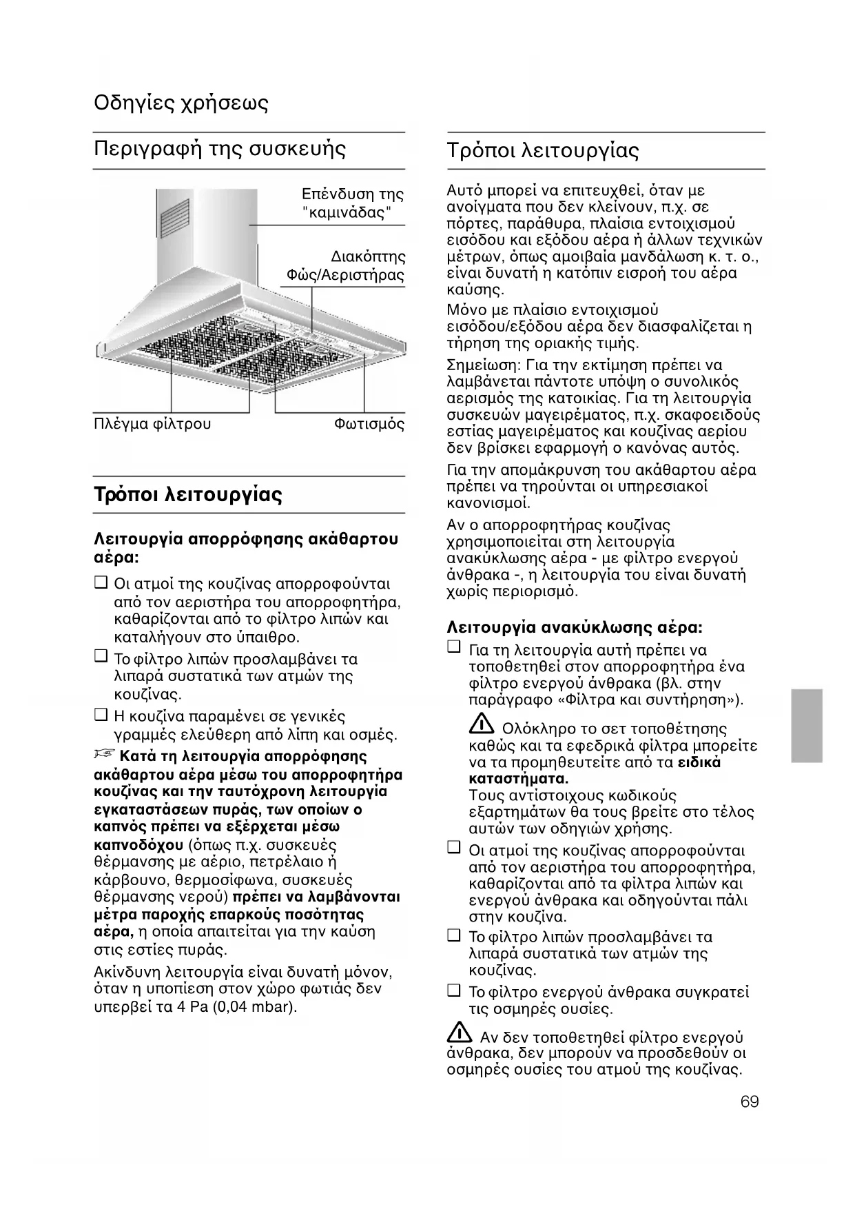 Τρποι λειτουργίας Αυτ µπορεί να επιτευχθεί, ταν µεανοίγµατα που δεν κλείνουν, π.χ. σεπρτες, παράθυρα, πλαίσια εντοιχισµούεισδου και εξδου αέρα ή άλλων τεχνικώνµέτρων, πως αµοιβαία µανδάλωση κ. τ. ο.,είναι δυνατή η κατπιν εισροή του αέρακαύσης.Μνο µε πλαίσιο εντοιχισµούεισδου/εξδου αέρα δεν διασφαλίζεται ητήρηση της οριακής τιµής.Σηµείωση: Για την εκτίµηση πρέπει ναλαµβάνεται πάντοτε υπψη ο συνολικςαερισµς της κατοικίας. Για τη λειτουργίασυσκευών µαγειρέµατος, π.χ. σκαφοειδούςεστίας µαγειρέµατος και κουζίνας αερίουδεν βρίσκει εφαρµογή ο καννας αυτς.Γι α την αποµάκρυνση του ακάθαρτου αέραπρέπει να τηρούνται οι υπηρεσιακοίκανονισµοί.Αν ο απορροφητήρας κουζίναςχρησιµοποιείται στη λειτουργίαανακύκλωσης αέρα - µε φίλτρο ενεργούάνθρακα -, η λειτουργία του είναι δυνατήχωρίς περιορισµ. Λειτουργία ανακύκλωσης αέρα: