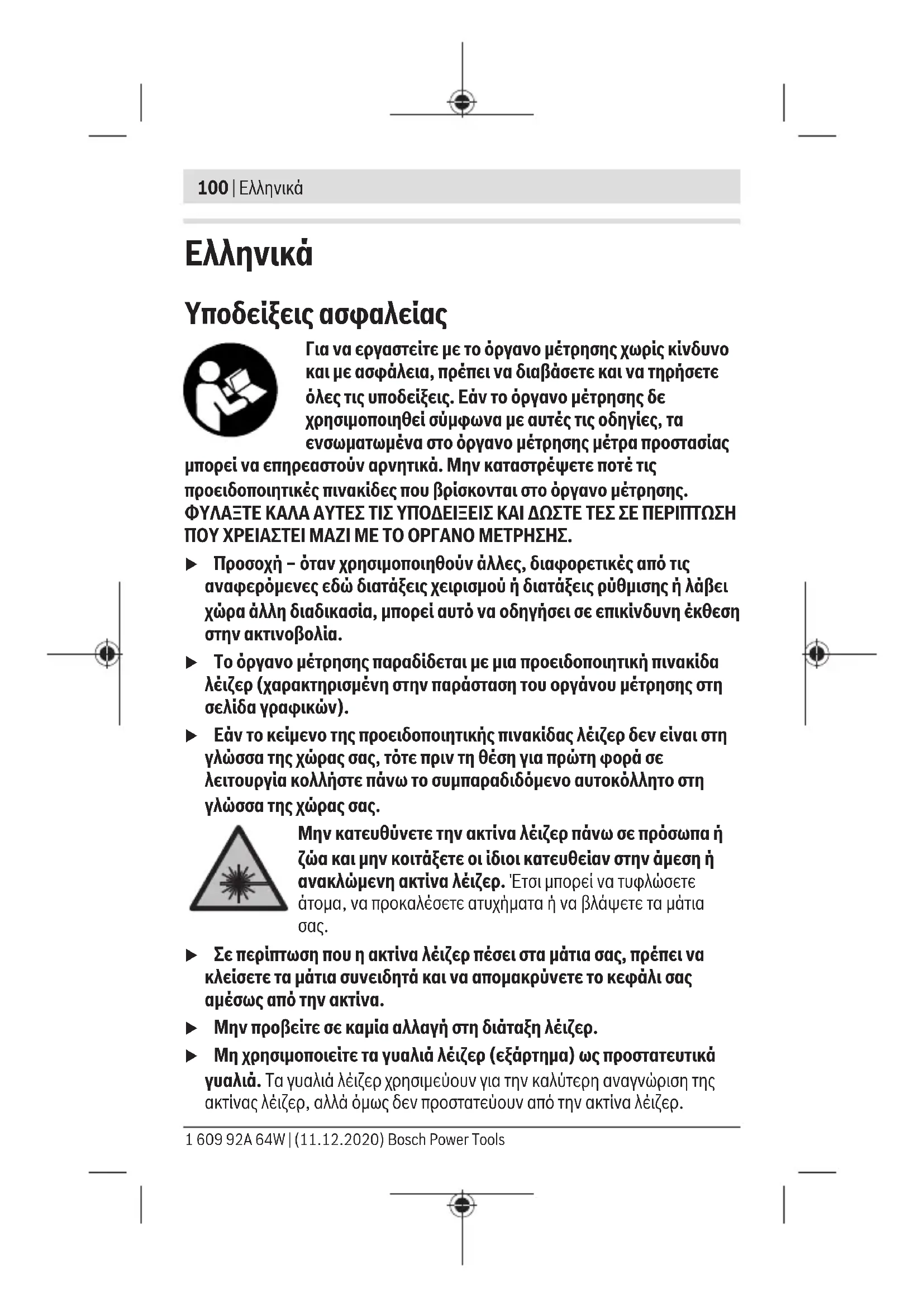 u Σε περίπτωση που η ακτίνα λέιζερ πέσει στα μάτια σας, πρέπει να κλείσετε τα μάτια συνειδητά και να απομακρύνετε το κεφάλι σας αμέσως από την ακτίνα. u Μην προβείτε σε καμία αλλαγή στη διάταξη λέιζερ. u Μη χρησιμοποιείτε τα γυαλιά λέιζερ (εξάρτημα) ως προστατευτικά γυαλιά. Τα γυαλιά λέιζερ χρησιμεύουν για την καλύτερη αναγνώριση της ακτίνας λέιζερ, αλλά όμως δεν προστατεύουν από την ακτίνα λέιζερ. 1 609 92A 64W | (11.12.2020) Bosch Power ToolsΕλληνικά | 101 u Μη χρησιμοποιείτε τα γυαλιά λέιζερ (εξάρτημα) ως γυαλιά ηλίου ή στην οδική κυκλοφορία. Τα γυαλιά λέιζερ δεν προσφέρουν πλήρη προστασία από την υπεριώδη ακτινοβολία και μειώνουν την αντίληψη των