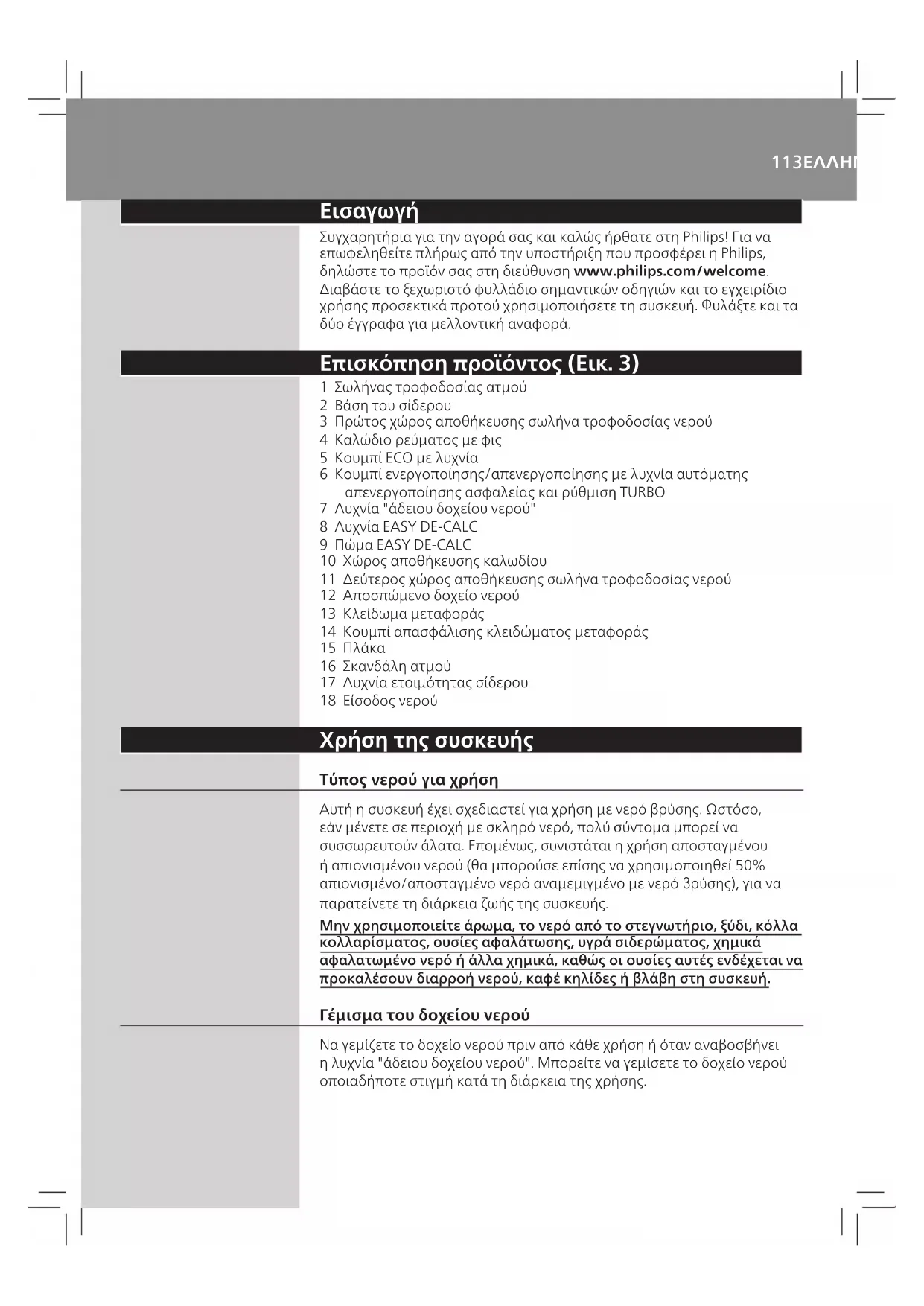 Συγχαρητήρια για την αγορά σας και καλώς ήρθατε στη Philips! Για να επωφεληθείτε πλήρως από την υποστήριξη που προσφέρει η Philips, δηλώστε το προϊόν σας στη διεύθυνση www.philips.com/welcome. Διαβάστε το ξεχωριστό φυλλάδιο σημαντικών οδηγιών και το εγχειρίδιο χρήσης προσεκτικά προτού χρησιμοποιήσετε τη συσκευή. Φυλάξτε και τα δύο έγγραφα για μελλοντική αναφορά. Επισκόπηση προϊόντος (Εικ. 3) 1 Σωλήνας τροφοδοσίας ατμού 2 Βάση του σίδερου 3 Πρώτος χώρος αποθήκευσης σωλήνα τροφοδοσίας νερού 4 Καλώδιο ρεύματος με φις 5 Κουμπί ECO με λυχνία 6 Κουμπί ενεργοποίησης/απενεργοποίησης με λυχνία αυτόματης απενεργοποίησης ασφαλείας και ρύθμιση TURBO 7 Λυχνία "άδειου δοχείου νερού" 8 Λυχνία EASY DE-CALC 9 Πώμα EASY DE-CALC 10 Χώρος αποθήκευσης καλωδίου 11 Δεύτερος χώρος αποθήκευσης σωλήνα τροφοδοσίας νερού 12 Αποσπώμενο δοχείο νερού 13 Κλείδωμα μεταφοράς 14 Κουμπί απασφάλισης κλειδώματος μεταφοράς 15 Πλάκα 16 Σκανδάλη ατμού 17 Λυχνία ετοιμότητας σίδερου 18 Είσοδος νερού Χρήση της συσκευής Τύπος νερού για χρήση Αυτή η συσκευή έχει σχεδιαστεί για χρήση με νερό βρύσης. Ωστόσο, εάν μένετε σε περιοχή με σκληρό νερό, πολύ σύντομα μπορεί να συσσωρευτούν άλατα. Επομένως, συνιστάται η χρήση αποσταγμένου ή απιονισμένου νερού (θα μπορούσε επίσης να χρησιμοποιηθεί 50% απιονισμένο/αποσταγμένο νερό αναμεμιγμένο με νερό βρύσης), για να παρατείνετε τη διάρκεια ζωής της συσκευής. Μηνχρησιμοποιείτεάρωμα,τονερόαπότοστεγνωτήριο,ξύδι,κόλλα κολλαρίσματος,ουσίεςαφαλάτωσης,υγράσιδερώματος,χημικά αφαλατωμένονερόήάλλαχημικά,καθώςοιουσίεςαυτέςενδέχεταινα προκαλέσουνδιαρροήνερού,καφέκηλίδεςήβλάβηστησυσκευή. Γέμισμα του δοχείου νερού Να γεμίζετε το δοχείο νερού πριν από κάθε χρήση ή όταν αναβοσβήνει η λυχνία "άδειου δοχείου νερού". Μπορείτε να γεμίσετε το δοχείο νερού οποιαδήποτε στιγμή κατά τη διάρκεια της χρήσης.114 1 Αφαιρέστετοδοχείονερούαπότησυσκευήκαιγεμίστετομενερό βρύσηςμέχριτηνένδειξηMAX. 2 Επανατοποθετήστετοδοχείονερούστησυσκευή,τοποθετώντας πρώτατοκάτωμέροςστησυσκευή. 3 Πιέστεπροςταμέσατοπάνωμέροςτουδοχείουνερούμέχρινα ασφαλίσειστηθέσητου("κλικ"). Λυχνία "άδειου δοχείου νερού" Όταν το δοχείο νερού είναι σχεδόν άδειο, η λυχνία "άδειου δοχείου νερού" αναβοσβήνει. Γεμίστε το δοχείο νερού και πιέστε τη σκανδάλη ατμού, για να αφήσετε τη συσκευή να θερμανθεί ξανά. Όταν η λυχνία ετοιμότητας σίδερου ανάβει σταθερά, μπορείτε να συνεχίσετε το σιδέρωμα με ατμό. Τεχνολογία Optimal Temp Η τεχνολογία Optimal Temp σάς επιτρέπει να σιδερώνετε όλους τους τύπους υφασμάτων που σιδερώνονται, με όποια σειρά θέλετε, χωρίς να ρυθμίζετε τη θερμοκρασία του σίδερου. Τα υφάσματα με αυτά τα σύμβολα μπορούν να σιδερωθούν. Τέτοια υφάσματα είναι τα λινά, τα βαμβακερά, ο πολυεστέρας, τα μεταξωτά, τα μάλλινα, η βισκόζη και το ρεγιόν. Τα υφάσματα με αυτό το σύμβολο δεν μπορούν να σιδερωθούν. Σε αυτά τα υφάσματα περιλαμβάνονται τα συνθετικά υφάσματα, όπως σπάντεξ ή ελαστάνη, υφάσματα με συνδυασμό σπάντεξ και πολυολεφίνες (π.χ. πολυπροπυλένιο), αλλά και ρούχα με στάμπες. ΕΛΛΗΝΙΚΆ115