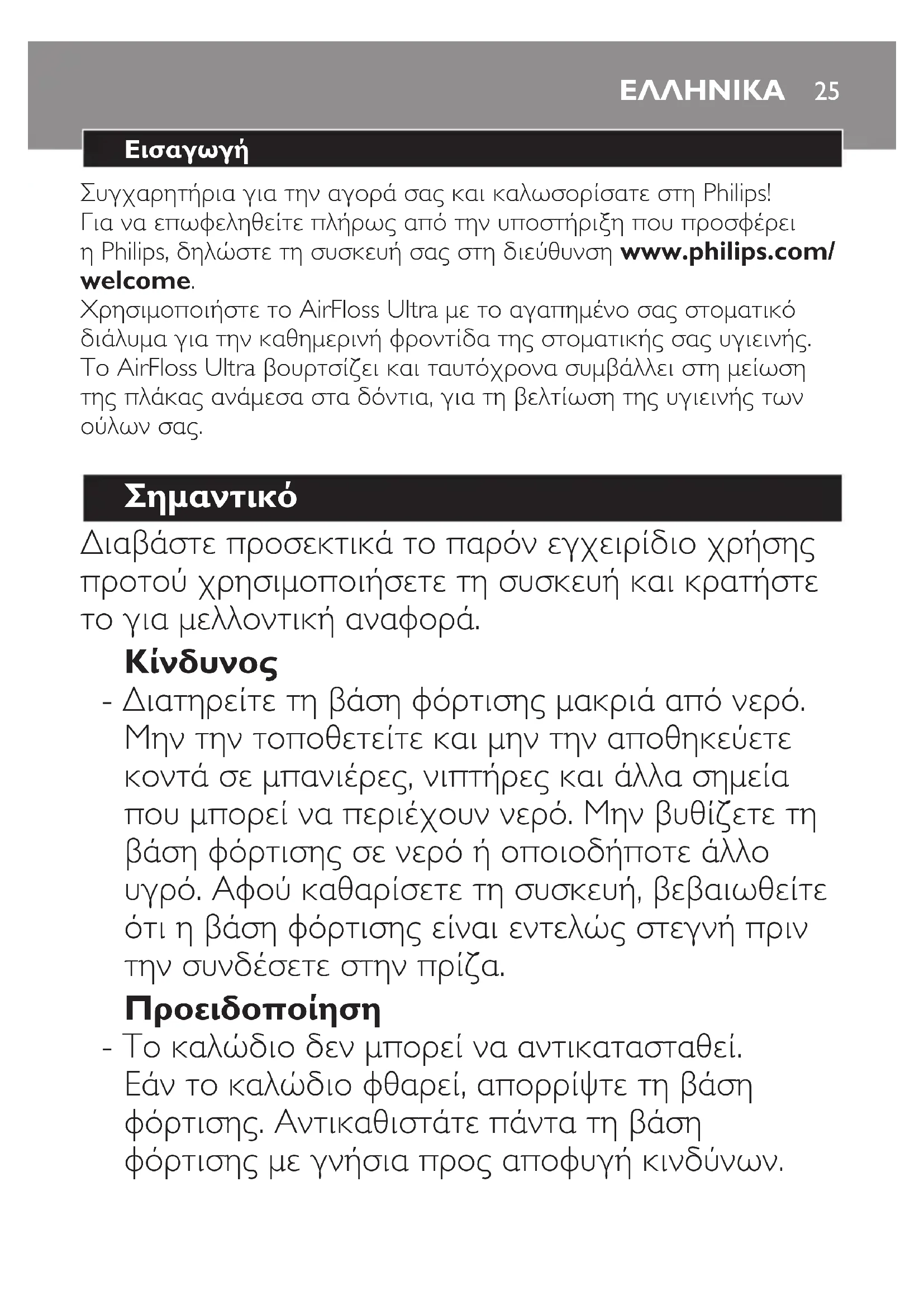 - Διατηρείτε τη βάση φόρτισης μακριά από νερό. Μην την τοποθετείτε και μην την αποθηκεύετε κοντά σε μπανιέρες, νιπτήρες και άλλα σημεία που μπορεί να περιέχουν νερό. Μην βυθίζετε τη βάση φόρτισης σε νερό ή οποιοδήποτε άλλο υγρό. Αφού καθαρίσετε τη συσκευή, βεβαιωθείτε ότι η βάση φόρτισης είναι εντελώς στεγνή πριν την συνδέσετε στην πρίζα. Προειδοποίηση - Το καλώδιο δεν μπορεί να αντικατασταθεί. Εάν το καλώδιο φθαρεί, απορρίψτε τη βάση φόρτισης. Αντικαθιστάτε πάντα τη βάση φόρτισης με γνήσια προς αποφυγή κινδύνων. ΕΛΛΗΝΙΚΑ- Για την επαναφόρτιση της μπαταρίας, να χρησιμοποιείτε μόνο τη βάση φόρτισης HX6100 που παρέχεται με το AirFloss Ultra. - Αν η συσκευή υποστεί οποιαδήποτε βλάβη (στόμιο ψεκασμού AirFloss Ultra, λαβή ή/και βάση φόρτισης), σταματήστε να την χρησιμοποιείτε. - Αυτή η συσκευή περιλαμβάνει μέρη που δεν επισκευάζονται. Εάν η συσκευή υποστεί βλάβη, επικοινωνήστε με το Κέντρο εξυπηρέτησης καταναλωτών στη χώρα σας (βλ. κεφάλαιο “Εγγύηση και υποστήριξη”). - Μην χρησιμοποιείτε τη βάση φόρτισης σε εξωτερικούς χώρους ή κοντά σε θερμαινόμενες επιφάνειες. - Αυτή η συσκευή μπορεί να χρησιμοποιηθεί από παιδιά ηλικίας 8 ετών και άνω, καθώς και από άτομα με περιορισμένες σωματικές, αισθητήριες ή διανοητικές ικανότητες ή χωρίς εμπειρία και γνώση, με την προϋπόθεση ότι τη χρησιμοποιούν υπό επίβλεψη ή έχουν λάβει οδηγίες σχετικά με την ασφαλή της χρήση και κατανοούν τους ενεχόμενους κινδύνους. Τα παιδιά δεν πρέπει να παίζουν με τη συσκευή. Τα παιδιά δεν πρέπει να καθαρίζουν τη συσκευή ή να εκτελούν διεργασίες συντήρησης, εκτός και αν είναι μεγαλύτερα από 8 ετών και επιβλέπονται. ΕΛΛΗΝΙΚΑ26Προσοχή - Συμβουλευτείτε τον οδοντίατρό σας πριν χρησιμοποιήσετε τη συσκευή εάν έχετε χειρουργηθεί πρόσφατα στο στόμα ή τα ούλα, εάν πάσχετε από κάποια χρόνια πάθηση των δοντιών, εάν έχετε υποβληθεί τους τελευταίους 2 μήνες σε εκτεταμένη οδοντιατρική θεραπεία ή εάν υποψιάζεστε ότι υπάρχει κάποιο πρόβλημα με την οδοντιατρική σας θεραπεία (σφραγίσματα, θήκες κ.λπ.). - Συμβουλευτείτε τον οδοντίατρό σας εάν παρουσιαστεί υπερβολική αιμορραγία μετά τη χρήση αυτής της συσκευής ή εάν η αιμορραγία εξακολουθεί να παρουσιάζεται μετά από 4 εβδομάδες χρήσης. - Εάν αντιμετωπίζετε προβλήματα υγείας, συμβουλευτείτε το γιατρό σας πριν χρησιμοποιήσετε αυτήν τη συσκευή. - Αυτή η συσκευή της Philips συμμορφώνεται με τα πρότυπα ασφαλείας για τις ηλεκτρομαγνητικές συσκευές. Εάν χρησιμοποιείτε βηματοδότη ή οποιαδήποτε άλλη εμφυτευμένη συσκευή, επικοινωνήστε με το γιατρό σας ή με τον κατασκευαστή της εμφυτευμένης συσκευής πριν χρησιμοποιήσετε αυτήν τη συσκευή της Philips. - Μην χρησιμοποιείτε διαφορετικά εξαρτήματα από αυτά που συνιστά ο κατασκευαστής. ΕΛΛΗΝΙΚΑ 27- Μην ασκείτε υπερβολική πίεση στο στόμιο