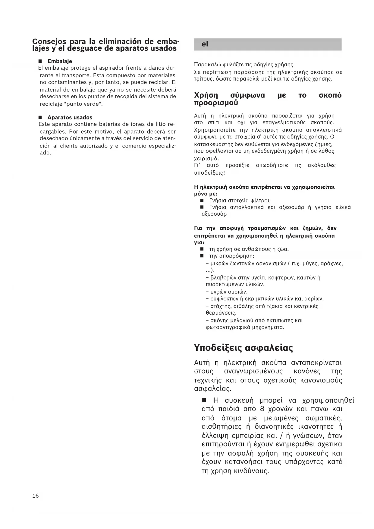 − βλαβερών στην υγεία, κοφτερών, καυτών ή πυρακτωμένων υλικών. − υγρών ουσιών. − εύφλεκτων ή εκρηκτικών υλικών και αερίων. − στάχτης, αιθάλης από τζάκια και κεντρικές θερμάνσεις. − σκόνης μελανιού από εκτυπωτές και φωτοαντιγραφικά μηχανήματα. Υποδείξεις ασφαλείας Αυτή η ηλεκτρική σκούπα ανταποκρίνεται στους αναγνωρισμένους κανόνες της τεχνικής και στους σχετικούς κανονισμούς