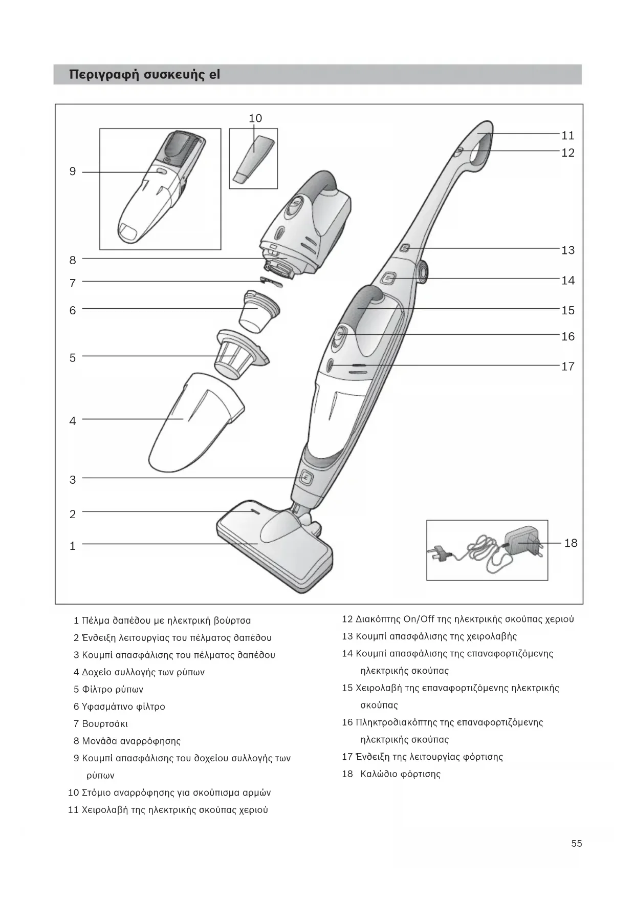 16 Πληκτροδιακόπτης της επαναφορτιζόμενης ηλεκτρικής σκούπας 17 Ένδειξη της λειτουργίας φόρτισης 18 Σταθμός φόρτισης 19 Στήριγμα δαπέδου του σταθμού φόρτισης 20 Καλώδιο φόρτισης Καλώδιο φόρτισης Περιγραφή συσκευής el56