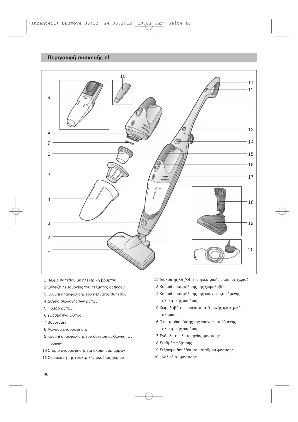 (Innenteil) BBHmove 05/12 24.05.2012 10:01 Uhr Seite 4546 Περιγραφή συσκευής el 1 Πέλμα δαπέδου με ηλεκτρική βούρτσα 2 Ένδειξη λειτουργίας του πέλματος δαπέδου 3 Κουμπί απασφάλισης του πέλματος δαπέδου 4 Δοχείο συλλογής των ρύπων 5 Φίλτρο ρύπων 6 Υφασμάτινο φίλτρο 7 Βουρτσάκι 8 Μονάδα αναρρόφησης 9 Κουμπί απασφάλισης του δοχείου συλλογής των