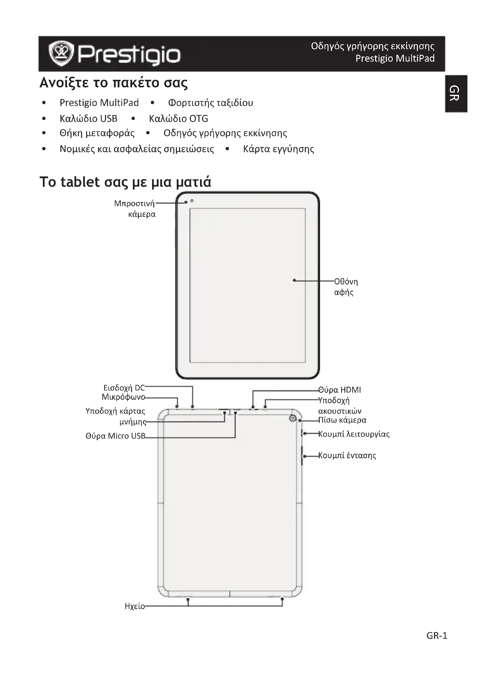 Οδηγός γρήγορης εκκίνησης Prestigio MultiPad Ανοίξτε το πακέτο σας