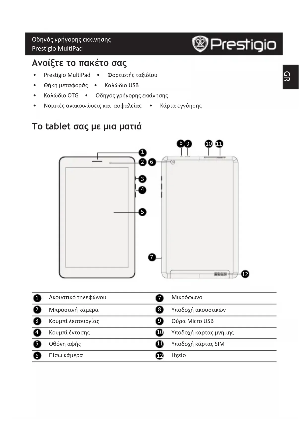 ΗχείοGR Οδηγός γρήγορης εκκίνησης Prestigio MultiPad