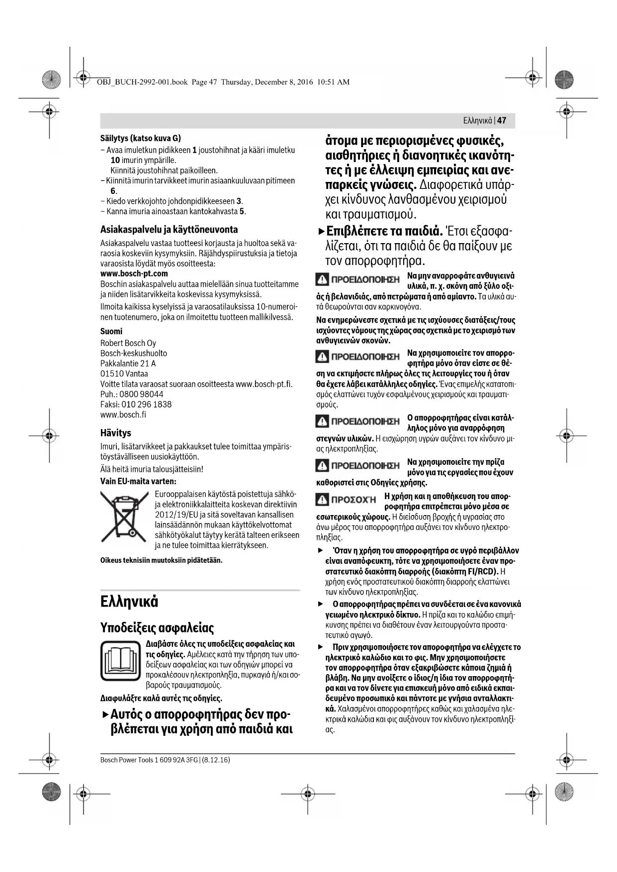 OBJ_BUCH-2992-001.book Page 47 Thursday, December 8, 2016 10:51 AM48 | Ελληνικά 1 609 92A 3FG | (8.12.16) Bosch Power Tools Να βγάζετε το φις από την πρίζα πριν συντηρήσετε ή κα- θαρίσετε το αποροφητήρα, πριν διεξάγετε κάποιες ρυθ- μίσεις σ’ αυτόν, ή όταν πρόκειται να αλλάξετε κάποια εξαρτήματά του καθώς καθώς και πριν τον διαφυλάξετε ή αποθηκεύσετε. Αυτό το προληπτικό μέτρο εμποδίζει την αθέλητη εκκίνηση του απορροφητήρα. Να φροντίζετε να υπάρχει καλός αερισμός στον χώρο που εργάζεστε. Να δίνετε τον απορροφητήρα για επισκευή από άριστα ειδικευμένο προσωπικό. Έτσι εξασφαλίζεται η διατήρηση της ασφάλειας του απορροφητήρα. Πριν αρχίσετε την εργασία σας να διαβεβαιώνεστε πά- ντοτε ότι ο σωλήνας αναρρόφησης βρίσκεται σε άριστη κατάσταση. Όταν διεξάγετε τον αντίστοιχο έλεγχο να αφήνετε το σωλήνα αναρρόφησης πάντοτε συναρμολο- γημένο στον απορροφητήρα για να εμποδίσετε έτσι την κατά λάθος διαφυγή σκόνης. Διαφορετικά μπορεί να ει- σπνεύσετε σκόνη. Να μην καθαρίζετε τον απορροφητήρα με κατευθείαν υδροβολή. Η διείσδυση νερού στο άνω τμήμα του απορρο- φητήρα αυξάνει τον κίνδυνο ηλεκτροπληξίας.