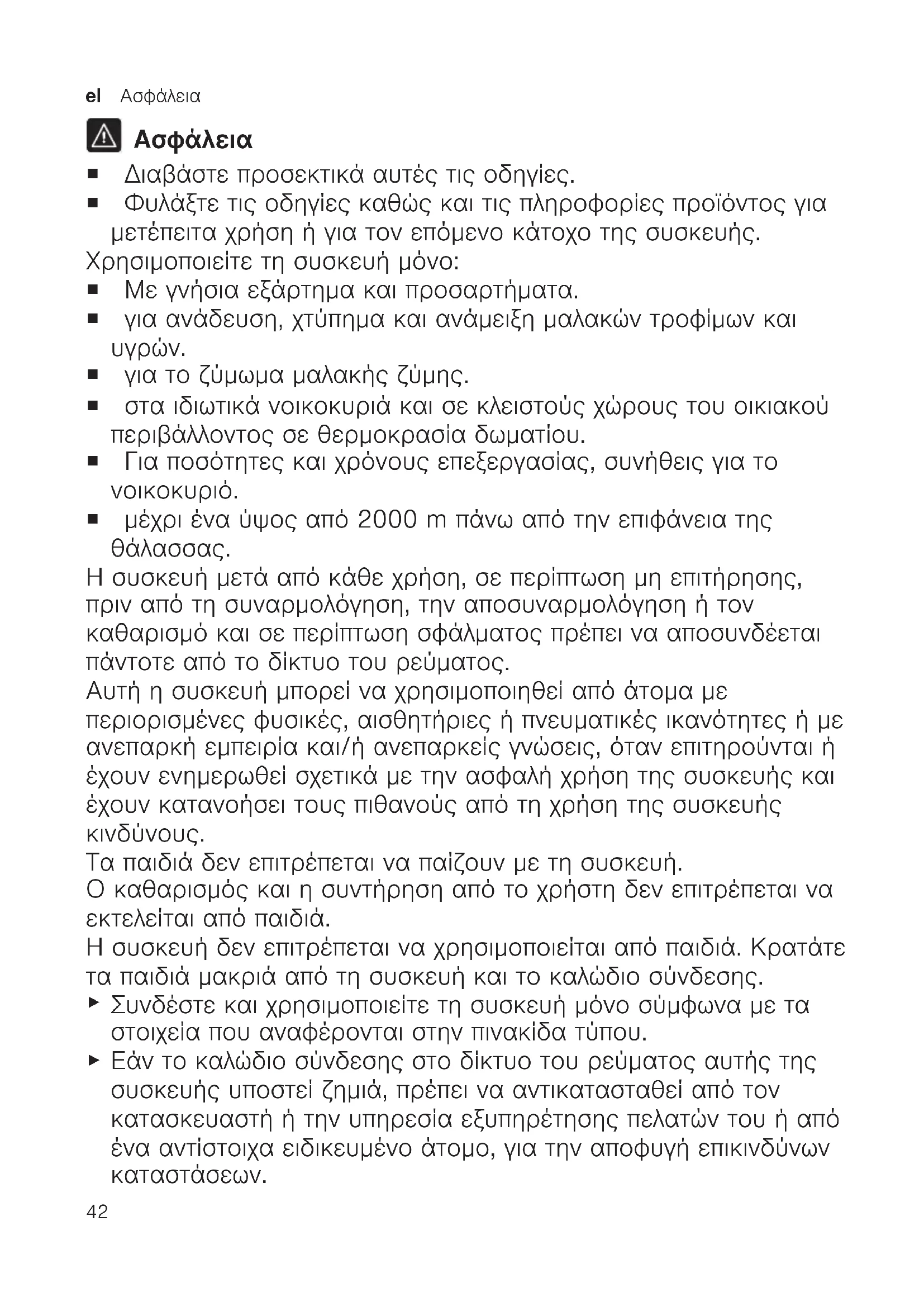 Η συσκευή μετά από κάθε χρήση, σε περίπτωση μη επιτήρησης, πριν από τη συναρμολόγηση, την αποσυναρμολόγηση ή τον καθαρισμό και σε περίπτωση σφάλματος πρέπει να αποσυνδέεται πάντοτε από το δίκτυο του ρεύματος. Αυτή η συσκευή μπορεί να χρησιμοποιηθεί από άτομα με περιορισμένες φυσικές, αισθητήριες ή πνευματικές ικανότητες ή με ανεπαρκή εμπειρία και/ή ανεπαρκείς γνώσεις, όταν επιτηρούνται ή έχουν ενημερωθεί σχετικά με την ασφαλή χρήση της συσκευής και έχουν κατανοήσει τους πιθανούς από τη χρήση της συσκευής