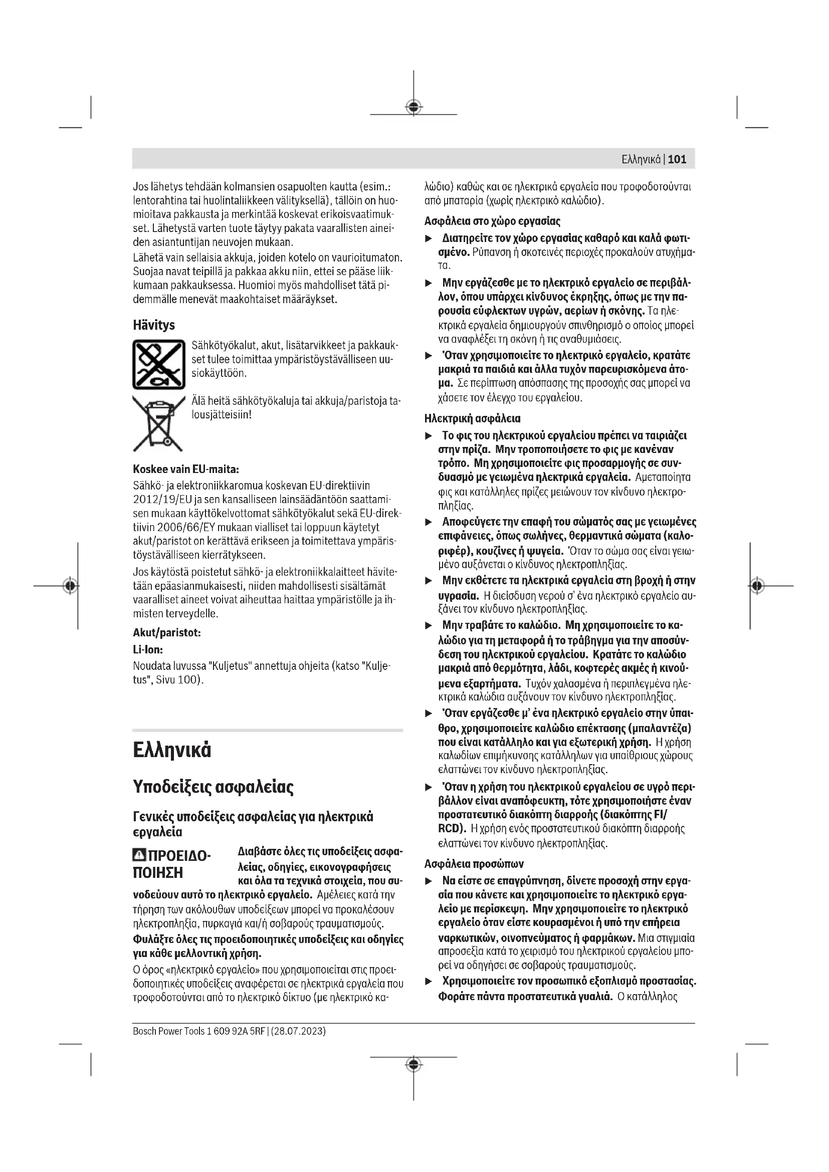 u Αποφεύγετε την επαφή του σώματός σας με γειωμένες επιφάνειες, όπως σωλήνες, θερμαντικά σώματα (καλο- ριφέρ), κουζίνες ή ψυγεία. Όταν το σώμα σας είναι γειω- μένο αυξάνεται ο κίνδυνος ηλεκτροπληξίας. u Μην εκθέτετε τα ηλεκτρικά εργαλεία στη βροχή ή στην υγρασία. Η διείσδυση νερού σ’ ένα ηλεκτρικό εργαλείο αυ- ξάνει τον κίνδυνο ηλεκτροπληξίας. u Μην τραβάτε το καλώδιο. Μη χρησιμοποιείτε το κα- λώδιο για τη μεταφορά ή το τράβηγμα για την αποσύν- δεση του ηλεκτρικού εργαλείου. Κρατάτε το καλώδιο μακριά από θερμότητα, λάδι, κοφτερές ακμές ή κινού- μενα εξαρτήματα. Τυχόν χαλασμένα ή περιπλεγμένα ηλε- κτρικά καλώδια αυξάνουν τον κίνδυνο ηλεκτροπληξίας. u Όταν εργάζεσθε μ’ ένα ηλεκτρικό εργαλείο στην ύπαι- θρο, χρησιμοποιείτε καλώδιο επέκτασης (μπαλαντέζα) που είναι κατάλληλο και για εξωτερική χρήση. Ηχρήση καλωδίων επιμήκυνσης κατάλληλων για υπαίθριους χώρους ελαττώνει τον κίνδυνο ηλεκτροπληξίας. u Όταν η χρήση του ηλεκτρικού εργαλείου σε υγρό περι- βάλλον είναι αναπόφευκτη, τότε χρησιμοποιήστε έναν προστατευτικό διακόπτη διαρροής (διακόπτηςFI/ RCD). Ηχρήση ενός προστατευτικού διακόπτη διαρροής ελαττώνει τον κίνδυνο ηλεκτροπληξίας. Ασφάλεια προσώπων u Να είστε σε επαγρύπνηση, δίνετε προσοχή στην εργα- σία που κάνετε και χρησιμοποιείτε το ηλεκτρικό εργα- λείο με περίσκεψη. Μην χρησιμοποιείτε το ηλεκτρικό εργαλείο όταν είστε κουρασμένοι ή υπό την επήρεια ναρκωτικών, οινοπνεύματος ή φαρμάκων. Μια στιγμιαία απροσεξία κατά το χειρισμό του ηλεκτρικού εργαλείου μπο- ρεί να οδηγήσει σε σοβαρούς τραυματισμούς. u Χρησιμοποιείτε τον προσωπικό εξοπλισμό προστασίας. Φοράτε πάντα προστατευτικά γυαλιά. Ο κατάλληλος Bosch Power Tools 1 609 92A 5RF | (28.07.2023)102 | Ελληνικά προστατευτικός εξοπλισμός, όπως μάσκα προστασίας από σκόνη, αντιολισθητικά υποδήματα ασφαλείας, προστατευτι- κό κράνος ή ωτασπίδες, ανάλογα με τις εκάστοτε συνθήκες, ελαττώνει τον κίνδυνο τραυματισμών. u Αποφεύγετε την αθέλητη εκκίνηση. Βεβαιωθείτε, ότι ο διακόπτης είναι στη θέση Off, πριν συνδέσετε το ηλε- κτρικό εργαλείο με την πηγή τροφοδοσίας και/ή την μπαταρία καθώς και πριν το παραλάβετε ή το μετα- φέρετε. Όταν μεταφέρετε τα ηλεκτρικά εργαλεία έχοντας το δάχτυλό σας στο διακόπτη ή όταν συνδέσετε τα ηλεκτρι- κά εργαλεία με την πηγή ρεύματος όταν αυτά είναι ακόμη στη θέση ΟΝ, τότε δημιουργείται κίνδυνος τραυματισμών. u Απομακρύνετε από το ηλεκτρικό εργαλείο τυχόν εξαρ- τήματα ρύθμισης ή κλειδιά πριν θέσετε το ηλεκτρικό εργαλείο σε λειτουργία. Ένα εργαλείο ή κλειδί συναρμο- λογημένο σ’ ένα περιστρεφόμενο τμήμα ενός ηλεκτρικού εργαλείου μπορεί να οδηγήσει σε τραυματισμούς. u Προσέχετε πως στέκεστε. Φροντίζετε για την ασφαλή στάση του σώματός σας και διατηρείτε πάντοτε την ισο- ρροπία σας. Έτσι μπορείτε να ελέγξετε καλύτερα το ηλε- κτρικό εργαλείο σε περιπτώσεις απροσδόκητων περιστάσε-