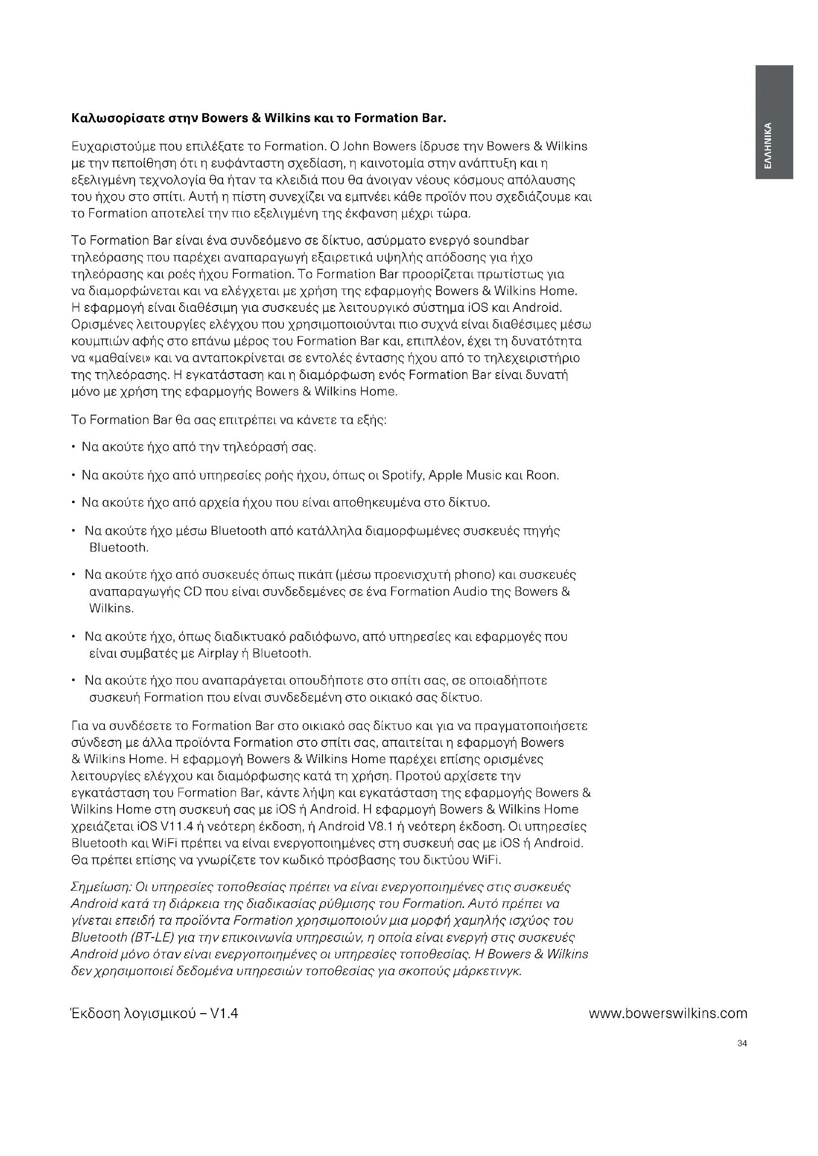 - Να ακούτε ήχο που αναπαράγεται οπουδήποτε στο σπίτι σας, σε οποιαδήποτε συσκευή Formation που είναι συνδεδεμένη στο οικιακό σας δίκτυο. Για να συνδέσετε το Formation Bar στο οικιακό σας δίκτυο και για να πραγματοποιήσετε σύνδεση με άλλα προϊόντα Formation στο σπίτι σας, απαιτείται η εφαρμογή Bowers & Wilkins Home. Η εφαρμογή Bowers & Wilkins Home παρέχει επίσης ορισμένες λειτουργίες ελέγχου και διαμόρφωσης κατά τη χρήση. Προτού αρχίσετε την εγκατάσταση του Formation Bar, κάντε λήψη και εγκατάσταση της εφαρμογής Bowers & Wilkins Home στη συσκευή σας με iOS ή Android. Η εφαρμογή Bowers & Wilkins Home χρειάζεται iOS V11.4 ή νεότερη έκδοση, ή Android V8.1 ή νεότερη έκδοση. Οι υπηρεσίες Bluetooth και WiFi πρέπει να είναι ενεργοποιημένες στη συσκευή σας με iOS ή Android. Θα πρέπει επίσης να γνωρίζετε τον κωδικό πρόσβασης του δικτύου WiFi. Σημείωση: Οι υπηρεσίες τοποθεσίας πρέπει να είναι ενεργοποιημένες στις συσκευές Android κατά τη διάρκεια της διαδικασίας ρύθμισης του Formation. Αυτό πρέπει να γίνεται επειδή τα προϊόντα Formation χρησιμοποιούν μια μορφή χαμηλής ισχύος του Bluetooth (BT-LE) για την επικοινωνία υπηρεσιών, η οποία είναι ενεργή στις συσκευές Android μόνο όταν είναι ενεργοποιημένες οι υπηρεσίες τοποθεσίας. Η Bowers & Wilkins δεν χρησιμοποιεί δεδομένα υπηρεσιών τοποθεσίας για σκοπούς μάρκετινγκ. Έκδοση λογισμικού – V1.4