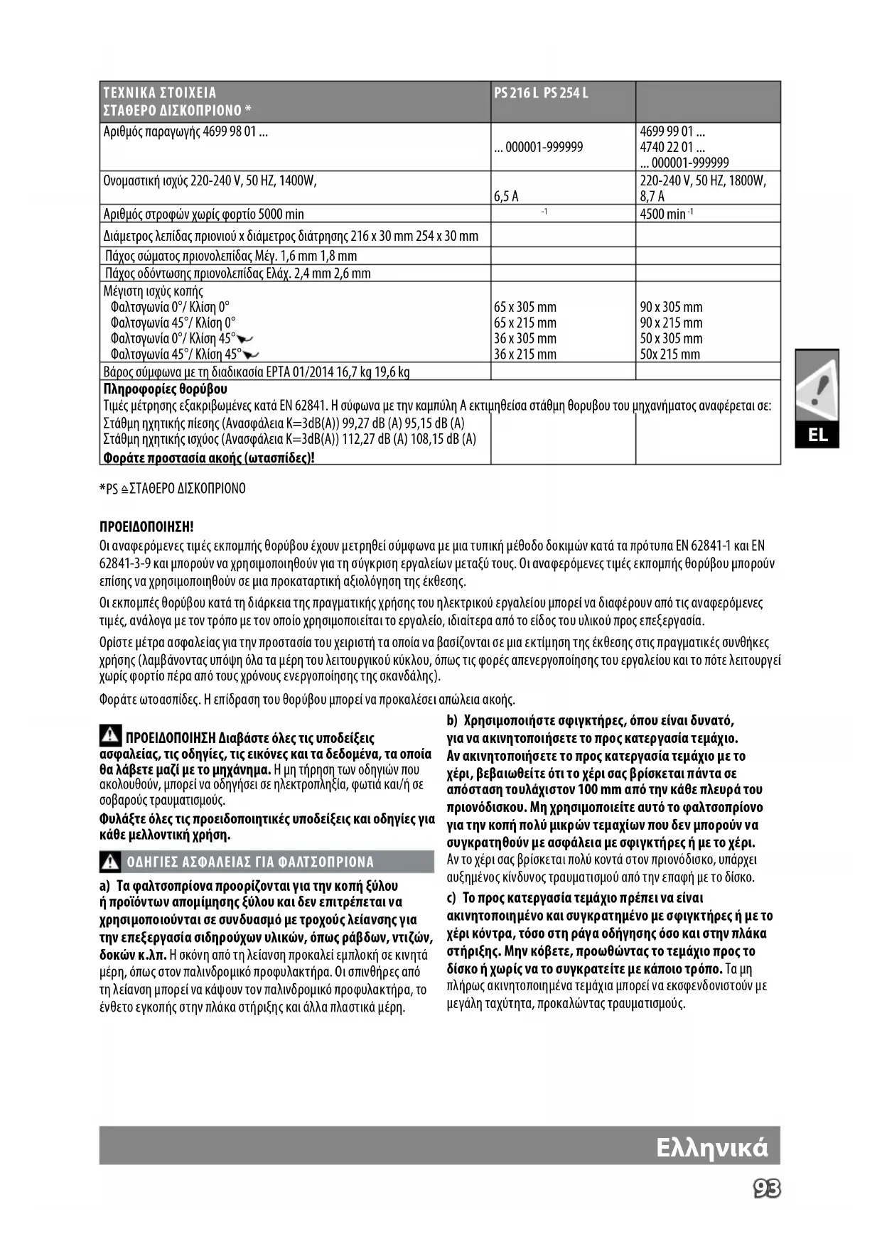 ΤΕΧΝΙΚΑ ΣΤΟΙΧΕΙΑ ΣΤΑΘΕΡΟ ΔΙΣΚΟΠΡΙΟΝΟ * PS 216 L PS 254 L Αριθμός παραγωγής 4699 98 01 ... ... 000001-999999