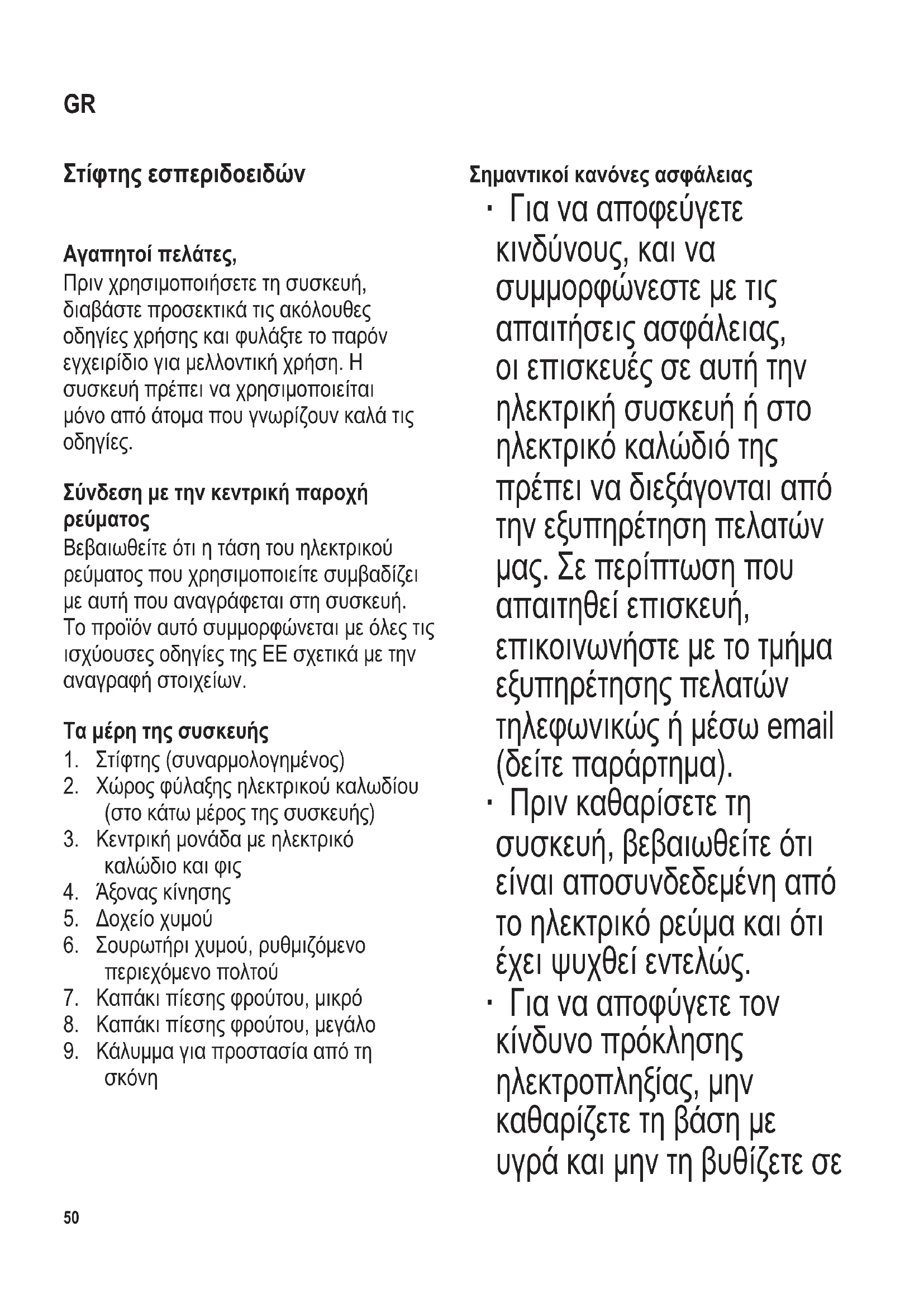 πουπροκαλούνταιλόγωλανθασμένης χρήσηςήεπειδήδενέχουντηρηθείοι παρούσεςοδηγίες. Πριν από την πρώτη χρήση Πρινχρησιμοποιήσετετονστίφτη εσπεριδοειδώνγιαπρώτηφορά,θαπρέπει νατονκαθαρίσετεόπωςπεριγράφεται στηνπαράγραφο«Καθαρισμός και