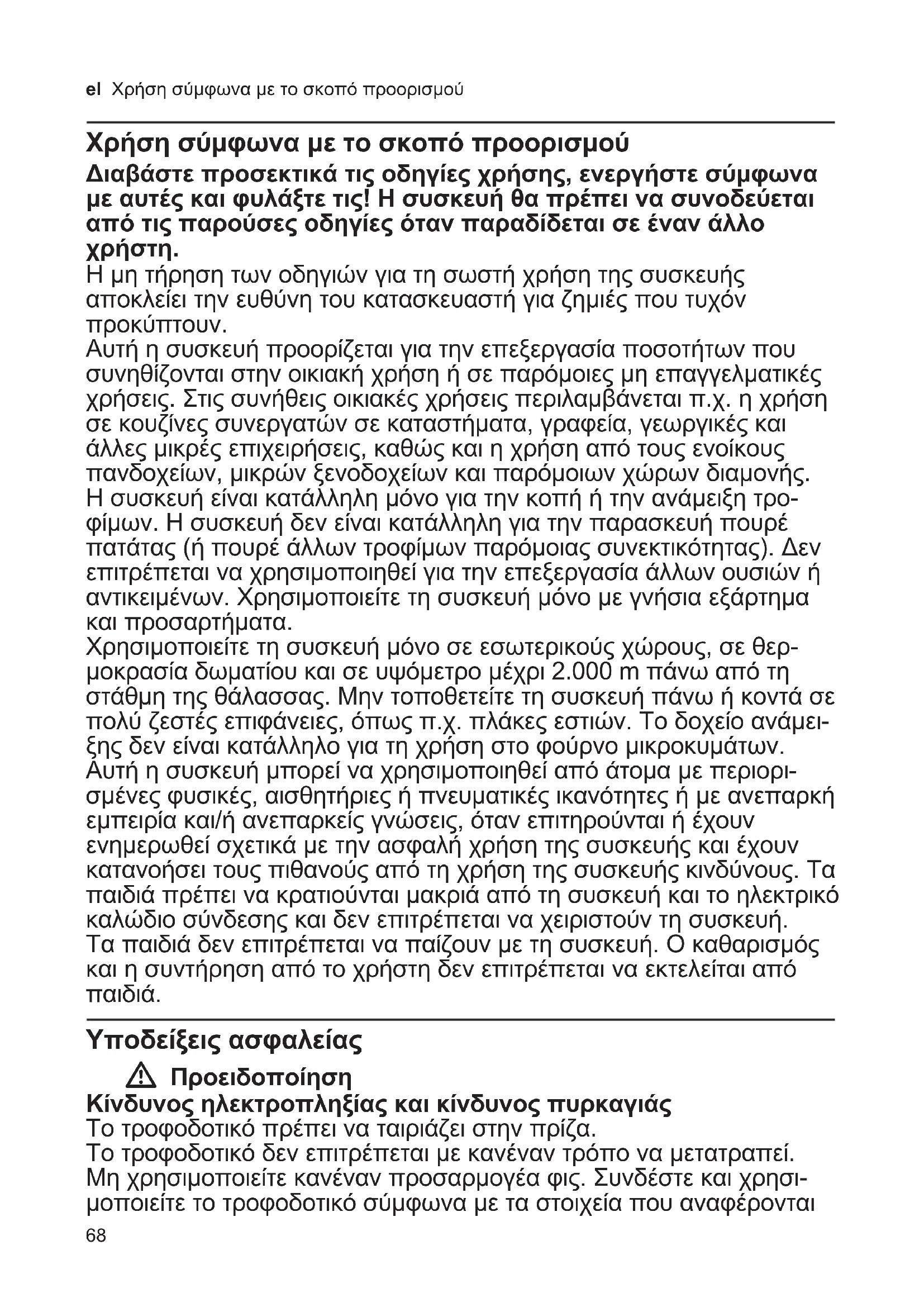 Η μη τήρηση των οδηγιών για τη σωστή χρήση της συσκευής αποκλείει την ευθύνη του κατασκευαστή για ζημιές που τυχόν προκύπτουν. Αυτή η συσκευή προορίζεται για την επεξεργασία ποσοτήτων που συνηθίζονται στην οικιακή χρήση ή σε παρόμοιες μη επαγγελματικές χρήσεις. Στις συνήθεις οικιακές χρήσεις περιλαμβάνεται π.χ. η χρήση σε κουζίνες συνεργατών σε καταστήματα, γραφεία, γεωργικές και άλλες μικρές επιχειρήσεις, καθώς και η χρήση από τους ενοίκους πανδοχείων, μικρών ξενοδοχείων και παρόμοιων χώρων διαμονής. Η συσκευή είναι κατάλληλη μόνο για την κοπή ή την ανάμειξη τρο- φίμων. Η συσκευή δεν είναι κατάλληλη για την παρασκευή πουρέ πατάτας (ή πουρέ άλλων τροφίμων παρόμοιας συνεκτικότητας). Δεν επιτρέπεται να χρησιμοποιηθεί για την επεξεργασία άλλων ουσιών ή αντικειμένων. Χρησιμοποιείτε τη συσκευή μόνο με γνήσια εξάρτημα και προσαρτήματα. Χρησιμοποιείτε τη συσκευή μόνο σε εσωτερικούς χώρους, σε θερ- μοκρασία δωματίου και σε υψόμετρο μέχρι 2.000 m πάνω από τη στάθμη της θάλασσας. Μην τοποθετείτε τη συσκευή πάνω ή κοντά σε πολύ ζεστές επιφάνειες, όπως π.χ. πλάκες εστιών. Το δοχείο ανάμει- ξης δεν είναι κατάλληλο για τη χρήση στο φούρνο μικροκυμάτων. Αυτή η συσκευή μπορεί να χρησιμοποιηθεί από άτομα με περιορι- σμένες φυσικές, αισθητήριες ή πνευματικές ικανότητες ή με ανεπαρκή εμπειρία και/ή ανεπαρκείς γνώσεις, όταν επιτηρούνται ή έχουν ενημερωθεί σχετικά με την ασφαλή χρήση της συσκευής και έχουν κατανοήσει τους πιθανούς από τη χρήση της συσκευής κινδύνους. Τα παιδιά πρέπει να κρατιούνται μακριά από τη συσκευή και το ηλεκτρικό καλώδιο σύνδεσης και δεν επιτρέπεται να χειριστούν τη συσκευή. Τα παιδιά δεν επιτρέπεται να παίζουν με τη συσκευή. Ο καθαρισμός και η συντήρηση από το χρήστη δεν επιτρέπεται να εκτελείται από