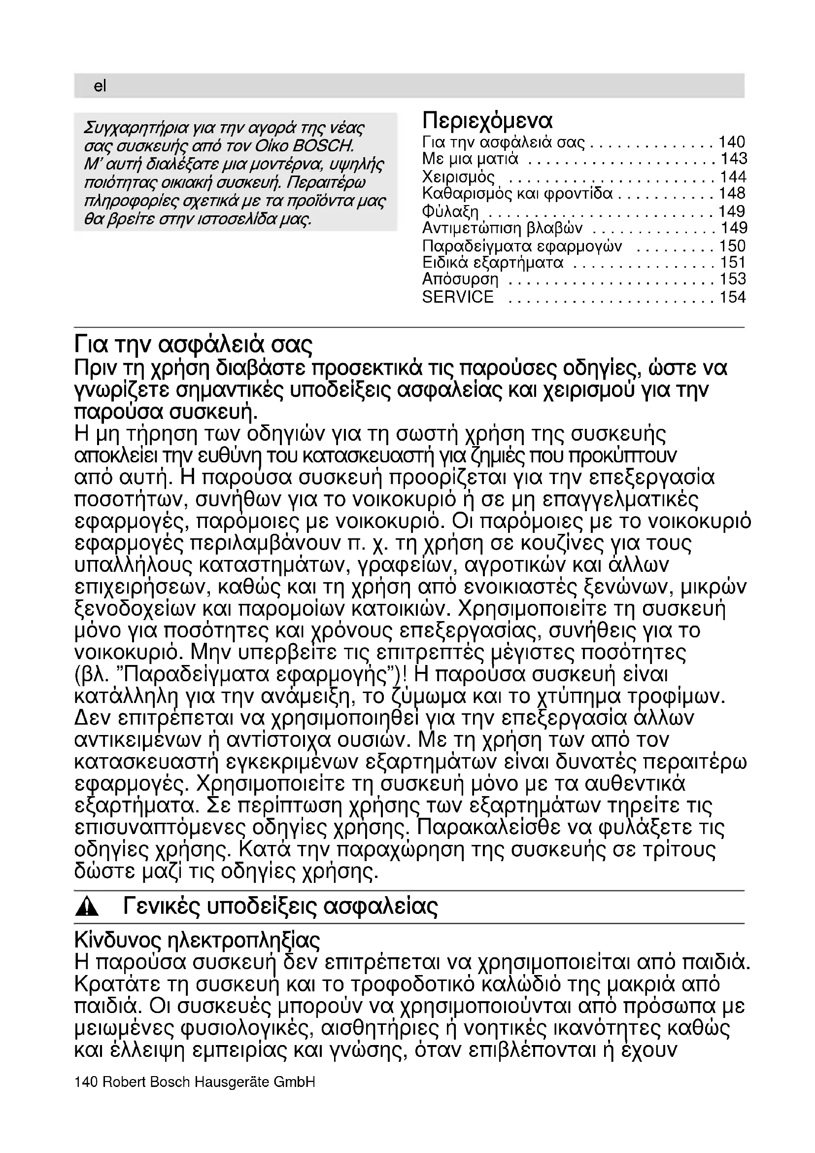 Συγχαρητήρια για την αγορά της νέας σας συσκευής από τον Oίκο BOSCH. Μ’ αυτή διαλέξατε μια μοντέρνα, υψηλής ποιότητας οικιακή συσκευή. Περαιτέρω πληροφορίες σχετικά με τα προϊόντα μας θα βρείτε στην ιστοσελίδα μας.Robert Bosch Hausgeräte GmbH 141 καταρτιστεί σχετικά με την ασφαλή χρήση της συσκευής και έχουν κατανοήσει τους κινδύνους που απορρέουν από αυτή. Τα παιδιά δεν επιτρέπεται να παίζουν με τη συσκευή. Μη λειτουργείτε τη συσκευή χωρίς επίβλεψη. Συνδέετε και λειτουργείτε τη συσκευή μόνο σύμφωνα με τα στοιχεία στην πινακίδα τύπου. Χρησιμοποιείτε τη συσκευή μόνο σε κλειστούς χώρους. Χρησιμοποιείτε τη συσκευή μόνον, όταν αυτή και το καλώδιό της δεν παρουσιάζουν βλάβες. Πριν την αλλαγή εξαρτημάτων ή προσαρτημάτων, τα οποία κινούνται κατά τη λειτουργία, η συσκευή πρέπει να απενεργοποιηθεί και να απομονωθεί από το δίκτυο. Όταν δεν την επιβλέπετε – πριν τη συναρμολόγηση, την αποσυναρμολόγηση ή τον καθαρισμό – η συσκευή πρέπει να απομονώνεται πάντοτε από το δίκτυο. Μη φέρνετε το τροφοδοτικό καλώδιο σε επαφή με αιχμηρές άκρες ή με καυτές επιφάνειες. Η αλλαγή του τροφοδοτικού καλωδίου, όταν αυτό παρουσιάζει κάποια βλάβη, πρέπει να γίνεται από τον κατασκευαστή ή την αντίστοιχη υπηρεσία τεχνικής εξυπηρέτησης πελατών ή από κατάλληλα καταρτισμένο πρόσωπο, ώστε να αποφεύγονται οι κίνδυνοι. Οι επισκευές στη συσκευή πρέπει να ανατίθενται μόνο στην υπηρεσία τεχνικής εξυπηρέτησης των πελατών μας. , Υποδείξεις ασφαλείας για την παρούσα συσκευή Κίνδυνος τραυματισμού Κίνδυνος ηλεκτροπληξίας! Βάλτε το φις στην πρίζα, αφού ολοκληρωθούν πρώτα όλες οι προετοιμασίες για την εργασία με τη συσκευή. Μη βυθίσετε ποτέ τη βασική συσκευή μέσα σε υγρό ούτε να την κρατήσετε κάτω από τρεχούμενο νερό. Μη χρησιμοποιήσετε ατμοκαθαριστή. Μην αλλάξετε τη ρύθμιση του στρεφόμενου βραχίονα, ενόσω η συσκευή βρίσκεται σε λειτουργία. Περίμενετε την πλήρη ακινητοποίηση της κίνησης. Αλλάζετε τα εργαλεία/ εξαρτήματα μόνο με ακινητοποιημένη την κίνηση – μετά την απενεργοποίηση η κίνηση περιστρέφεται για κάμποσο χρόνο ακόμα. Θέτετε τη συσκευή σε και εκτός λειτουργίας αποκλειστικά με τον περιστρεφόμενο διακόπτη. Όταν δε χρησιμοποιείται η συσκευή, βγάζετε το φις από την πρίζα. Πριν την αντιμετώπιση βλαβών βγάζετε το φις από την πρίζα. Κίνδυνος τραυματισμού από περιστρεφόμενα εργαλεία! Μην πιάνετε τα περιστρεφόμενα μέρη. Κατά τη λειτουργία μη βάζετε ποτέ το χέρι σας μέσα στο μπολ. Δουλεύετε μόνο με τοποθετημένο το καπάκι (12). Αλλάζετε το εργαλείο μόνο με ακινητοποιημένη την κίνηση – μετά την θέση εκτός λειτουργίας el142 Robert Bosch Hausgeräte GmbH η κίνηση εξακολουθεί να λειτουργεί για λίγο χρόνο και ακινητο- ποιείται στη θέση αλλαγής εργαλείου. Κινείτε τον στρεφόμενο βραχίονα, αφού ακινητοποιηθεί πρώτα το εργαλείο. Για λόγους ασφαλείας η συσκευή μπορεί να λειτουργήσει μόνον, όταν είναι καλυμμένες οι μη χρησιμοποιούμενες κινήσεις με τα καπάκια προστασίας κίνησης (5, 8). Τοποθετείτε/αφαιρείτε τον κόφτη γενικής χρήσης μόνο με ακινητοποιημένη την κίνηση ή με βγαλμένο το φις από την πρίζα. Μη βάζετε τα χέρια σας μέσα στο στόμιο πλήρωσης. Κίνδυνος τραυματισμού από το κοφτερό μαχαίρι! Μην πιάνετε τα κοφτερά μαχαίρια και τις ακμές των δίσκων κοπής. Πιάνετε τους δίσκους κοπής μόνο στην άκρη. Μην αγγίζετε το μαχαίρι του μίξερ με τα χέρια γυμνά. Κίνδυνος τραυματισμού από το κοφτερό μαχαίρι του μίξερ/την π