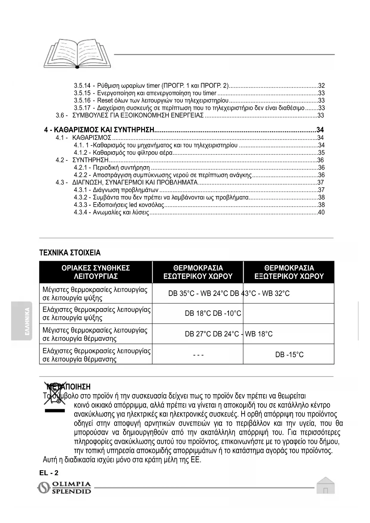 Κάθε προσπάθεια επισκευής που γίνεται από μη εξουσιοδοτημένο προσωπικό ακυρώνει άμεσα κάθε μορφή εγγύησης.30 EL - 38