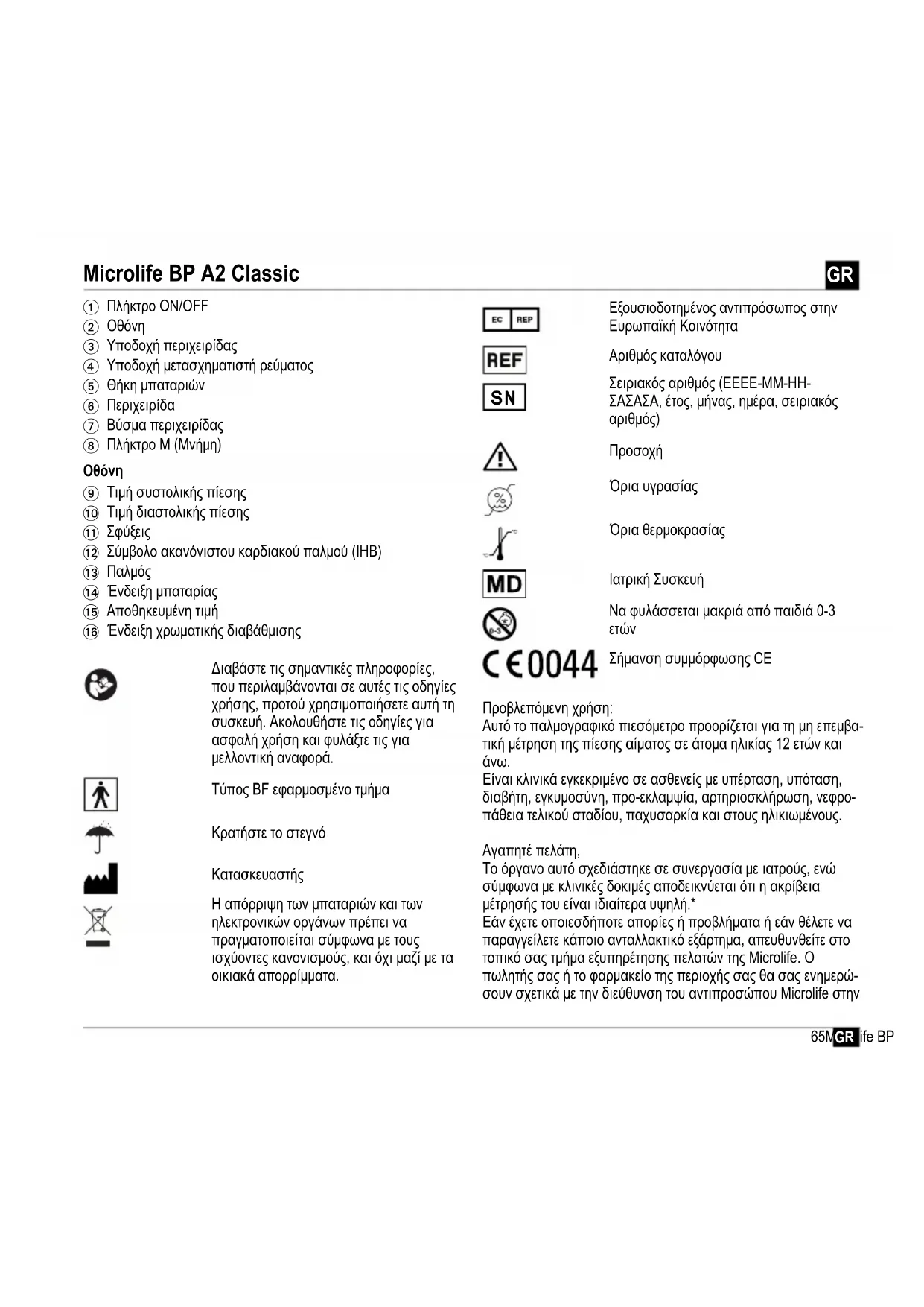 1 Πλήκτρο ON/OFF 2 Οθόνη 3 Υποδοχή περιχειρίδας 4 Υποδοχή μετασχηματιστή ρεύματος 5 Θήκη μπαταριών 6 Περιχειρίδα 7 Βύσμα περιχειρίδας 8 Πλήκτρο M (Μνήμη) 9 Τιμή συστολικής πίεσης AT Τιμή διαστολικής πίεσης AK Σφύξεις AL Σύμβολο ακανόνιστου καρδιακού παλμού (IHB) AM Παλμός AN Ένδειξη μπαταρίας AO Αποθηκευμένη τιμή AP Ένδειξη χρωματικής διαβάθμισης Διαβάστε τις σημαντικές πληροφορίες, που περιλαμβάνονται σε αυτές τις οδηγίες χρήσης, προτού χρησιμοποιήσετε αυτή τη συσκευή. Ακολουθήστε τις οδηγίες για ασφαλή χρήση και φυλάξτε τις για μελλοντική αναφορά. Τύπος BF εφαρμοσμένο τμήμα Κρατήστε το στεγνό Κατασκευαστής Η απόρριψη των μπαταριών και των ηλεκτρονικών οργάνων πρέπει να πραγματοποιείται σύμφωνα με τους ισχύοντες κανονισμούς, και όχι μαζί με τα οικιακά απορρίμματα. Εξουσιοδοτημένος αντιπρόσωπος στην Ευρωπαϊκή Κοινότητα Αριθμός καταλόγου Σειριακός αριθμός (ΕΕΕΕ-ΜΜ-ΗΗ- ΣΑΣΑΣΑ, έτος, μήνας, ημέρα, σειριακός