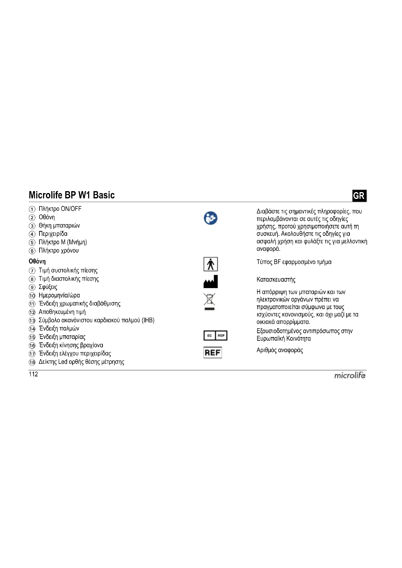Τύπος BF εφαρμοσμένο τμήμα Κατασκευαστής Η απόρριψη των μπαταριών και των ηλεκτρονικών οργάνων πρέπει να πραγματοποιείται σύμφωνα με τους ισχύοντες κανονισμούς, και όχι μαζί με τα οικιακά απορρίμματα. Εξουσιοδοτημένος αντιπρόσωπος στην Ευρωπαϊκή Κοινότητα Αριθμός αναφοράς113Microlife BP W1 Basic GR Προβλεπόμενη χρήση: Αυτό το παλμογραφικό πιεσόμετρο προορίζεται για τη μη επεμβα- τική μέτρηση της πίεσης αίματος σε άτομα ηλικίας 12 ετών και άνω.