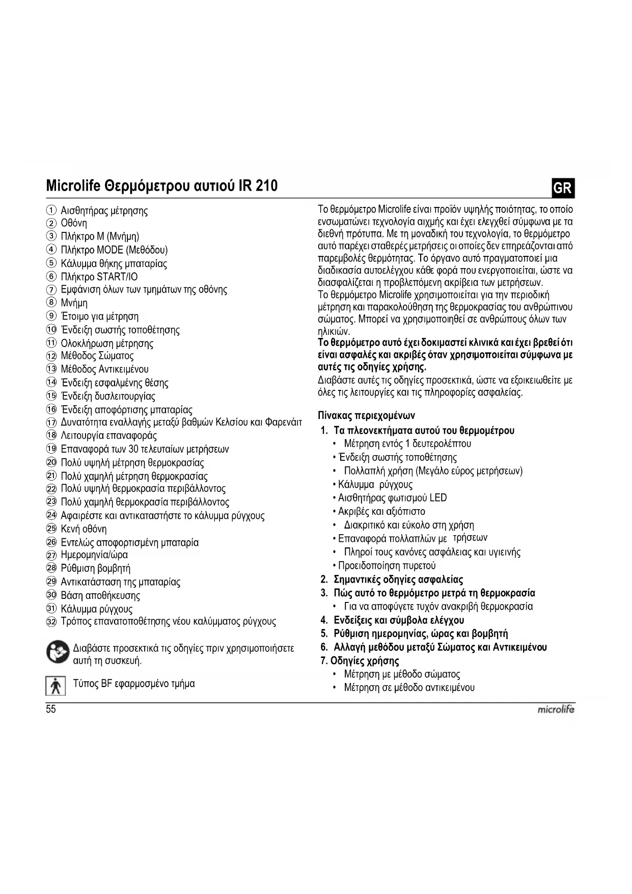 Automatisch uitschakelen: Ongeveer 1 minuut na de laatste meting. Batterij: 1 x CR2032 batterij 3V Levensduur batterij: ongeveer 800 metingen (met een nieuwe batterij) Afmetingen: 159 x 43 x 60 mm Gewicht: 60 g (met batterij), 58 g (zonder batterij) IP Klasse: IP22 Verwijzing naar normen: EN 12470-5; ASTM E1965;IEC 60601-1; IEC 60601-1-2 (EMC); IEC 60601-1-11 Verwachte levensduur: 5 jaar of 12000 metingen54IR 210 NL55 Διαβάστε προσεκτικά τις οδηγίες πριν χρησιμοποιήσετε αυτή τη συσκευή. Τύπος BF εφαρμοσμένο τμήμα Το θερμόμετρο Microlife είναι προϊόν υψηλής ποιότητας, το οποίο ενσωματώνει τεχνολογία αιχμής και έχει ελεγχθεί σύμφωνα με τα διεθνή πρότυπα. Με τη μοναδική του τεχνολογία, το θερμόμετρο αυτό παρέχει σταθερές μετρήσεις οι οποίες δεν επηρεάζονται από παρεμβολές θερμότητας. Το όργανο αυτό πραγματοποιεί μια διαδικασία αυτοελέγχου κάθε φορά που ενεργοποιείται, ώσ