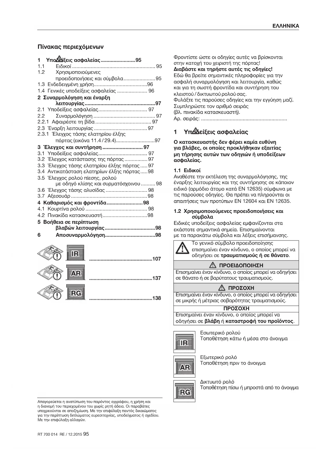 5 Βοήθεια σε περίπτωση βλαβών λειτουργίας ................................... 98 6 Αποσυναρμολόγηση ................................... 98 Φροντίστε ώστε οι οδηγίες αυτές να βρίσκονται στηνκατοχή του χειριστή της πόρτας! Διαβάστε και τηρήστε αυτές τις οδηγίες! Εδώ θα βρείτε σημαντικές πληροφορίες για την ασφαλή συναρμολόγηση και λειτουργία, καθώς καιγιατη σωστή φροντίδα και συντήρηση του κλειστού / δικτυωτού ρολού σας. Φυλάξτε τις παρούσες οδηγίες και την εγγύηση μαζί. Συμπληρώστε τον αριθμό σειράς (βλ.πινακίδακατασκευαστή). Αρ. σειράς: ............................................................ 1 Υποδείξεις ασφαλείας Ο κατασκευαστής δεν φέρει καμία ευθύνη γιαβλάβες, οι οποίες προκλήθηκαν εξαιτίας μητήρησης αυτών των οδηγιών ή υποδείξεων