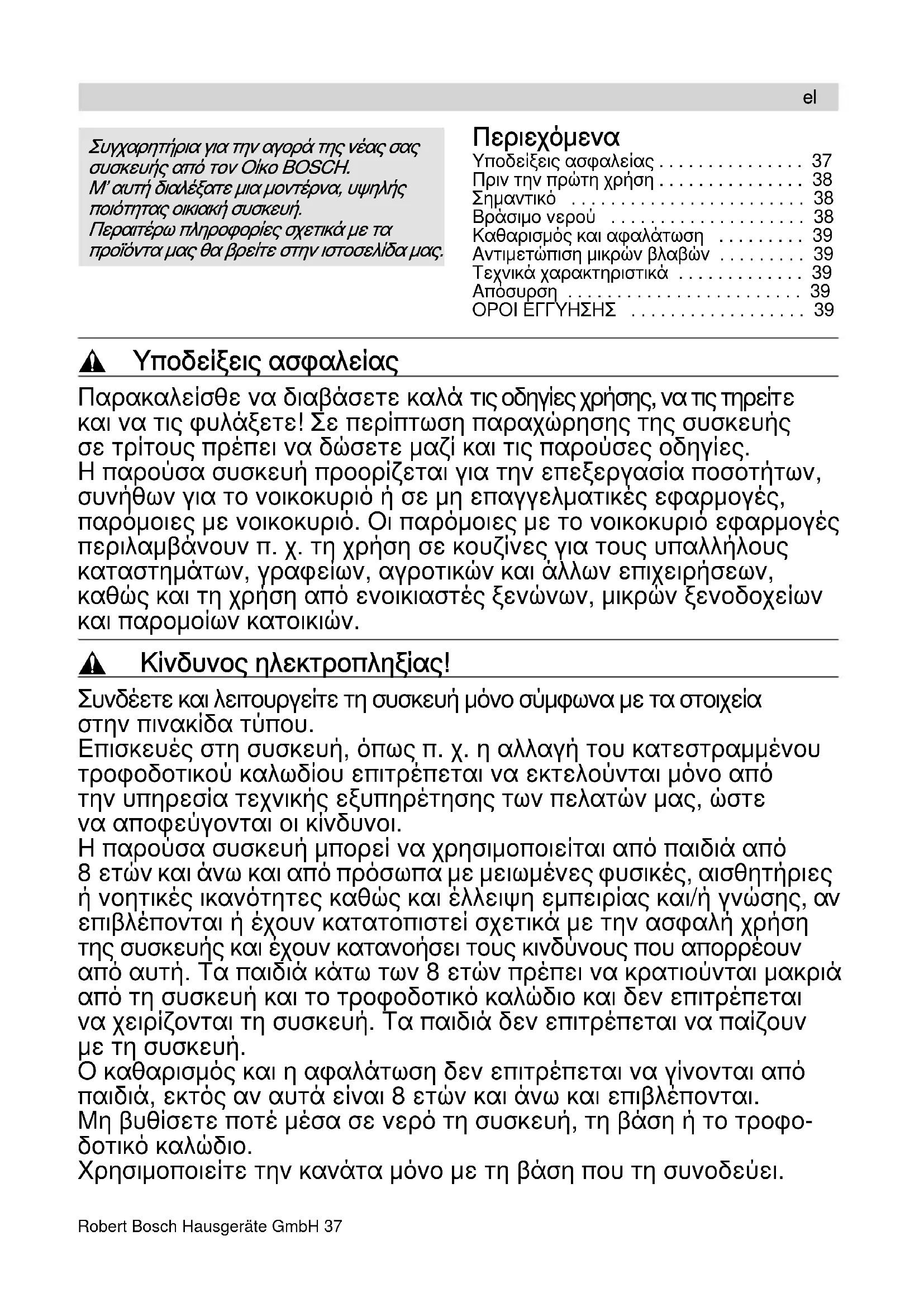 - ΟΡΟΙ ΕΓΓΥΗΣΗΣ , Υποδείξεις ασφαλείας Παρακαλείσθε να διαβάσετε καλά τις οδηγίες χρήσης, να τις τηρείτε και να τις φυλάξετε! Σε περίπτωση παραχώρησης της συσκευής σε τρίτους πρέπει να δώσετε μαζί και τις παρούσες οδηγίες. Η παρούσα συσκευή προορίζεται για την επεξεργασία ποσοτήτων, συνήθων για το νοικοκυριό ή σε μη επαγγελματικές εφαρμογές, παρόμοιες με νοικοκυριό. Οι παρόμοιες με το νοικοκυριό εφαρμογές περιλαμβάνουν π. χ. τη χρήση σε κουζίνες για τους υπαλλήλους καταστημάτων, γραφείων, αγροτικών και άλλων επιχειρήσεων, καθώς και τη χρήση από ενοικιαστές ξενώνων, μικρών ξενοδοχείων και παρομοίων κατοικιών. , Κίνδυνος ηλεκτροπληξίας! Συνδέετε και λειτουργείτε τη συσκευή μόνο σύμφωνα με τα στοιχεία στην πινακίδα τύπου. Επισκευές στη συσκευή, όπως π. χ. η αλλαγή του κατεστραμμένου τροφοδοτικού καλωδίου επιτρέπεται να εκτελούνται μόνο από την υπηρεσία τεχνικής εξυπηρέτησης των πελατών μας, ώστε να αποφεύγονται οι κίνδυνοι. Η παρούσα συσκευή μπορεί να χρησιμοποιείται από παιδιά από 8 ετών και άνω και από πρόσωπα με μειωμένες φυσικές, αισθητήριες ή νοητικές ικανότητες καθώς και έλλειψη εμπειρίας και/ή γνώσης, αν επιβλέπονται ή έχουν κατατοπιστεί σχετικά με την ασφαλή χρήση της συσκευής και έχουν κατανοήσει τους κινδύνους που απορρέουν από αυτή. Τα παιδιά κάτω των 8 ετών πρέπει να κρατιούνται μακριά από τη συσκευή και το τροφοδοτικό καλώδιο και δεν επιτρέπεται να χειρίζονται τη συσκευή. Τα παιδιά δεν επιτρέπεται να παίζουν με τη συσκευή. Ο καθαρισμός και η αφαλάτωση δεν επιτρέπεται να γίνονται από παιδιά, εκτός αν αυτά είναι 8 ετών και άνω και επιβλέπονται. Μη βυθίσετε ποτέ μέσα σε νερό τη συσκευή, τη βάση ή το τροφο- δοτικό καλώδιο. Χρησιμοποιείτε την κανάτα μόνο με τη βάση που τη συνοδεύει. p. 39