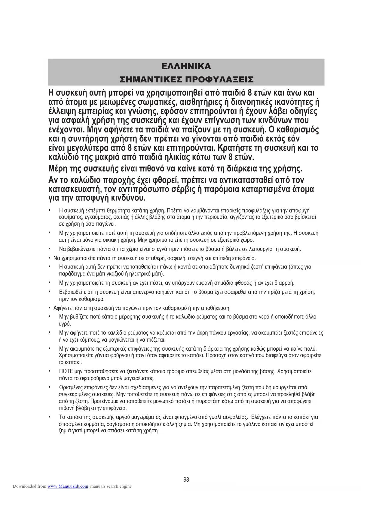 ΣΗΜΑΝΤΙΚΕΣ ΠΡΟΦΥΛΑΞΕΙΣ Η συσκευή αυτή μπορεί να χρησιμοποιηθεί από παιδιά 8 ετών και άνω και από άτομα με μειωμένες σωματικές, αισθητήριες ή διανοητικές ικανότητες ή έλλειψη εμπειρίας και γνώσης, εφόσον επιτηρούνται ή έχουν λάβει οδηγίες για ασφαλή χρήση της συσκευής και έχουν επίγνωση των κινδύνων που ενέχονται. Μην αφήνετε τα παιδιά να παίζουν με τη συσκευή. Ο καθαρισμός και η συντήρηση χρήστη δεν πρέπει να γίνονται από παιδιά εκτός εάν είναι μεγαλύτερα από 8 ετών και επιτηρούνται. Κρατήστε τη συσκευή και το καλώδιό της μακριά από παιδιά ηλικίας κάτω των 8 ετών. Μέρη της συσκευής είναι πιθανό να καίνε κατά τη διάρκεια της χρήσης. Αν το καλώδιο παροχής έχει φθαρεί, πρέπει να αντικατασταθεί από τον κατασκευαστή, τον αντιπρόσωπο σέρβις ή παρόμοια καταρτισμένα άτομα για την αποφυγή κινδύνου.