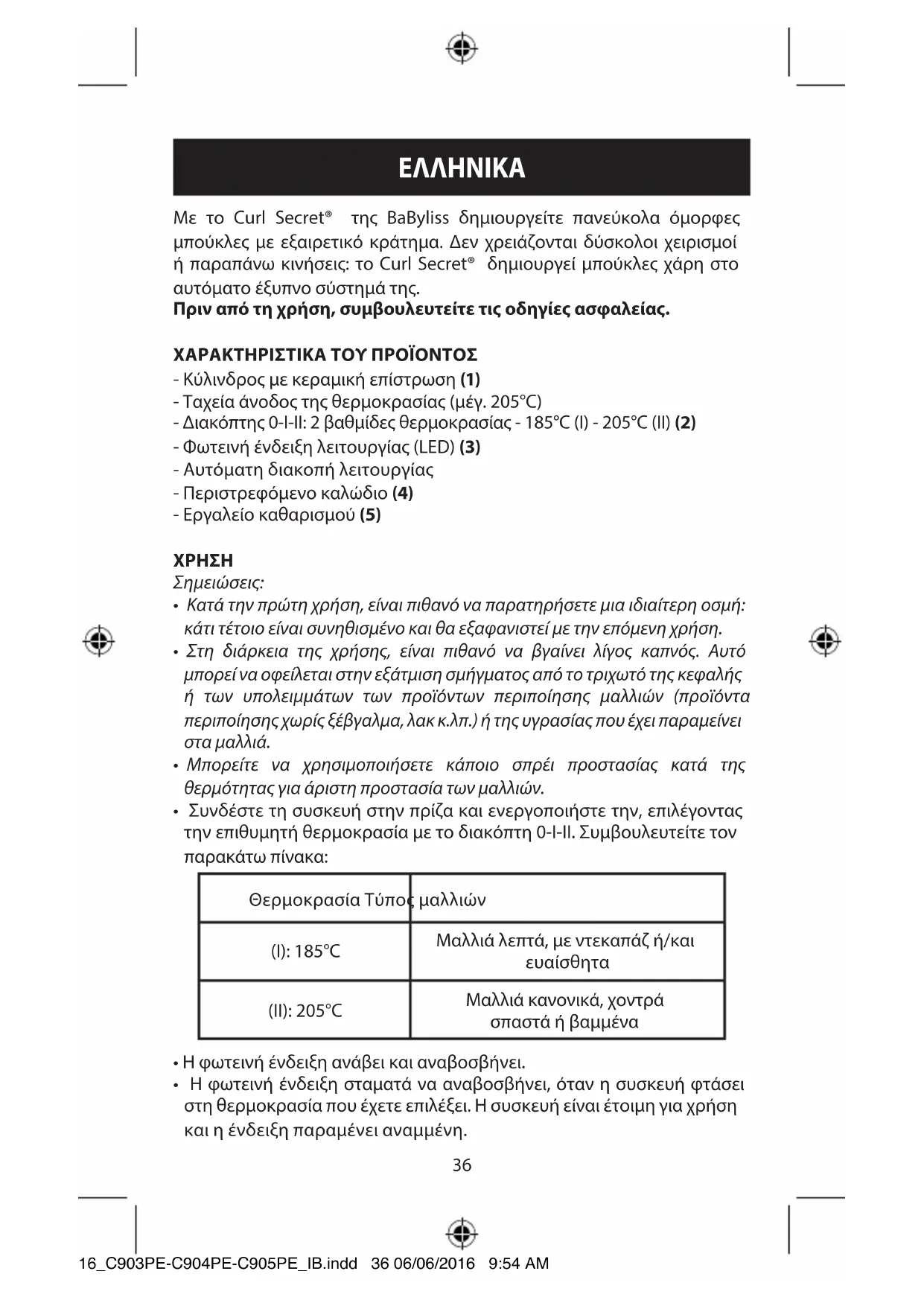 Με το Curl Secret® της BaByliss δημιουργείτε πανεύκολα όμορφες μπούκλες με εξαιρετικό κράτημα. Δεν χρειάζονται δύσκολοι χειρισμοί ή παραπάνω κινήσεις: το Curl Secret® δημιουργεί μπούκλες χάρη στο αυτόματο έξυπνο σύστημά της. Πριν από τη χρήση, συβουλευτείτε τι οδηγίε ασφαλεία. ΧΑΡΑΚΤΗΡΙΣΤΙΚΑ ΤΟΥ ΠΡΟΪΟΝΤΟΣ - Κύλινδρος με κεραμική επίστρωση (1) - Ταχεία άνοδος της θερμοκρασίας (μέγ. 205°C) - Διακόπτης 0-I-II: 2 βαθμίδες θερμοκρασίας - 185°C (I) - 205°C (II) (2) - Φωτεινή ένδειξη λειτουργίας (LED) (3) - Αυτόματη διακοπή λειτουργίας - Περιστρεφόμενο καλώδιο (4) - Εργαλείο καθαρισμού (5)