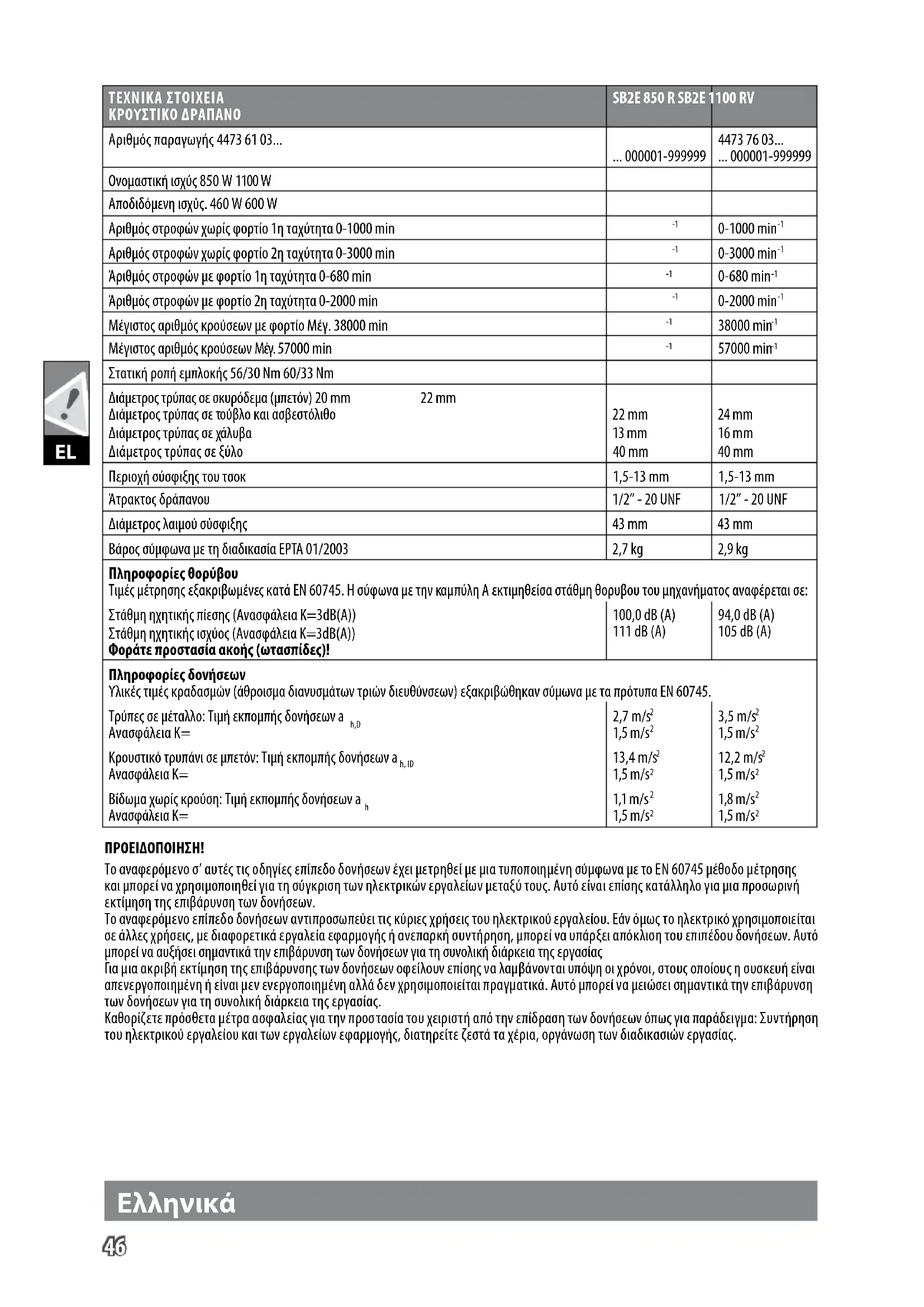 Παρακαλώ διαβάστε σχολαστικά τις οδηγίες χρήσης πριν από την έναρξη λειτουργίας. Εξαρτήματα - Δεν περιλαμβάνονται στα υλικά παράδοσης, συνιστούμενη προσθήκη από το πρόγραμμα εξαρτημάτων. Ηλεκτρικά μηχανήματα δεν επιτρέπεται να απορρίπτονται μαζί με τα οικιακά απορρίμματα. Ηλεκτρικά και ηλεκτρονικά μηχανήματα συλλέγονται ξεχωριστά και παραδίδονται προς ανακύκλωση με τρόπο φιλικό προς το περιβάλλον σε επιχείρηση επεξεργασίας απορριμμάτων. Ενημερωθείτε από τις τοπικές υπηρεσίες ή από ειδικευμένους εμπόρους σχετικά με κέντρα ανακύκλωσης και συλλογής απορριμμάτων. Ηλεκτρικό εργαλείο κατηγορίας ασφάλειας ΙΙ. Ηλεκτρικό εργαλείο στο οποίο η προστασία από ηλεκτροπληξία δεν εξαρτάται μόνο από την βασική μόνωση αλλά και από συμπληρωματικά μέτρα ασφάλειας όπως διπλή ή ενισχυμένη μόνωση. Σήμα συμμόρφωσης CE UkrSEPRO σήμα πιστότητας. EurAsian σήμα πιστότητας. Ελληνικά49 English Tür TEKNIK VERILER Vurmalı matkap makinesi SB2E 850 R SB2E 1100 RV Üretim numarası 4473 61 03... ... 000001-999999