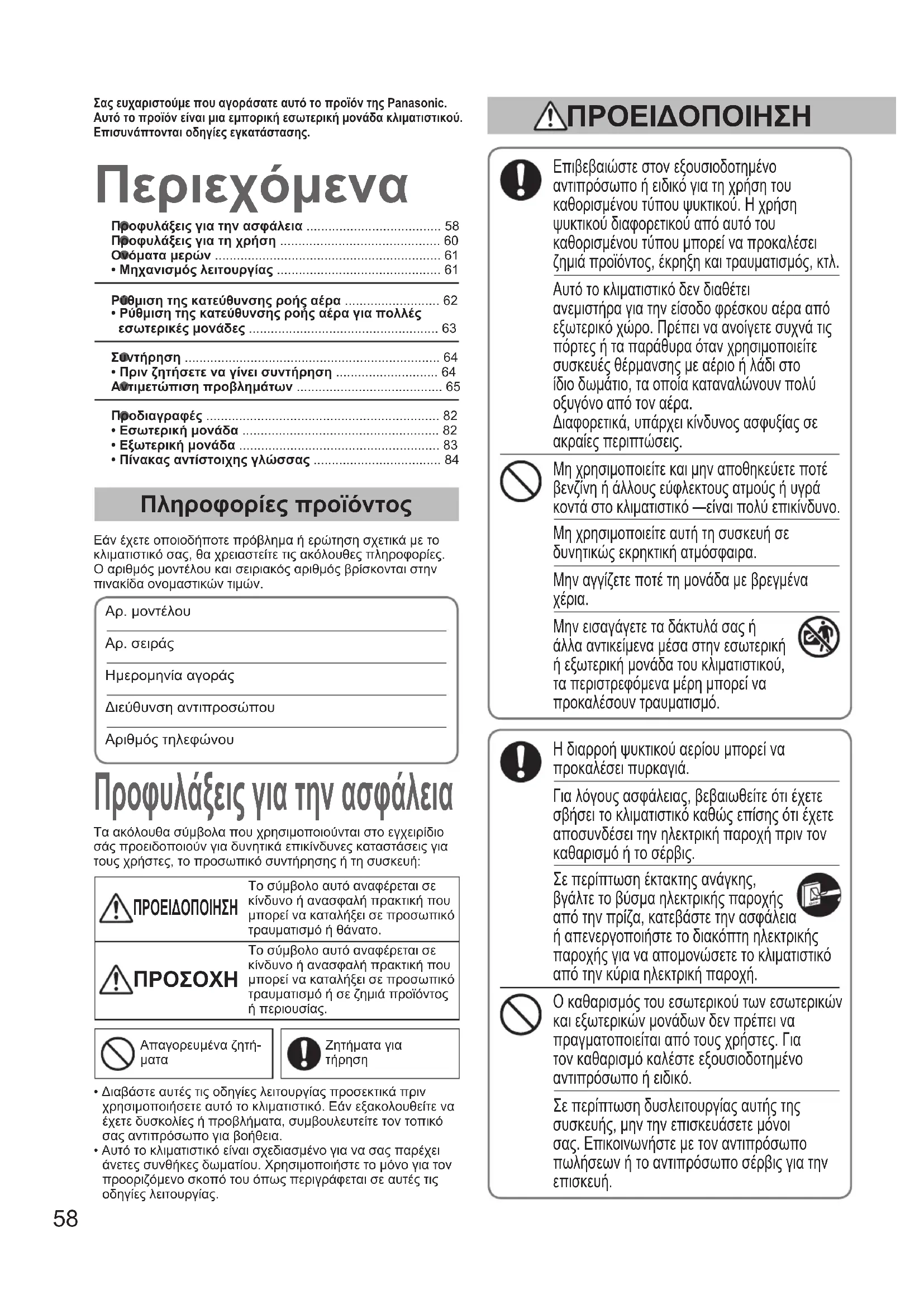 - Isso é para o funcionamento suave. Verique antes de consultar ou solicitar assistência. OI_00_038226_EU.indb 57 2014/7/10 9:08:4558 zΠροφυλάξειςγιατηνασφάλεια ..................................... 58 zΠροφυλάξειςγιατηχρήση ............................................ 60 zΟνόματαμερών .............................................................. 61•Μηχανισμόςλειτουργίας ............................................. 61 zΡύθμισητηςκατεύθυνσηςροήςαέρα .......................... 62•Ρύθμισητηςκατεύθυνσηςροήςαέραγιαπολλέςεσωτερικέςμονάδες .................................................... 63 zΣυντήρηση ...................................................................... 64•Πρινζητήσετεναγίνεισυντήρηση ............................ 64 zΑντιμετώπισηπροβλημάτων ........................................ 65 zΠροδιαγραφές ................................................................ 82•Εσωτερικήμονάδα ...................................................... 82•Εξωτερικήμονάδα ....................................................... 83•Πίνακαςαντίστοιχηςγλώσσας ................................... 84 Περιεχόμενα Προφυλάξειςγιατηνασφάλεια Πληροφορίεςπροϊόντος Εάν έχετε οποιοδήποτε πρόβλημα ή ερώτηση σχετικά με το κλιματιστικό σας, θα χρειαστείτε τις ακόλουθες πληροφορίες. Ο αριθμός μοντέλου και σειριακός αριθμός βρίσκονται στην πινακίδα ονομαστικών τιμών.Αρ. μοντέλου Αρ. σειράς Ημερομηνία αγοράςΔιεύθυνση αντιπροσώπουΑριθμός τηλεφώνου Επιβεβαιώστε στον εξουσιοδοτημένο αντιπρόσωπο ή ειδικό για τη χρήση του καθορισμένου τύπου ψυκτικού. Η χρήση ψυκτικού διαφορετικού από αυτό του καθορισμένου τύπου μπορεί να προκαλέσει ζημιά προϊόντος, έκρηξη και τραυματισμός, κτλ. Αυτό το κλιματιστικό δεν διαθέτει ανεμιστήρα για την είσοδο φρέσκου αέρα από εξωτερικό χώρο. Πρέπει να ανοίγετε συχνά τις πόρτες ή τα παράθυρα όταν χρησιμοποιείτε συσκευές θέρμανσης με αέριο ή λάδι στο ίδιο δωμάτιο, τα οποία καταναλώνουν πολύ οξυγόνο από τον αέρα. Διαφορετικά, υπάρχει κίνδυνος ασφυξίας σε ακραίες περιπτώσεις. Μη χρησιμοποιείτε και μην αποθηκεύετε ποτέ βενζίνη ή άλλους εύφλεκτους ατμούς ή υγρά κοντά στο κλιματιστικό —είναι πολύ επικίνδυνο. Μη χρησιμοποιείτε αυτή τη συσκευή σε δυνητικώς εκρηκτική ατμόσφαιρα. Μην αγγίζετε ποτέ τη μονάδα με βρεγμένα