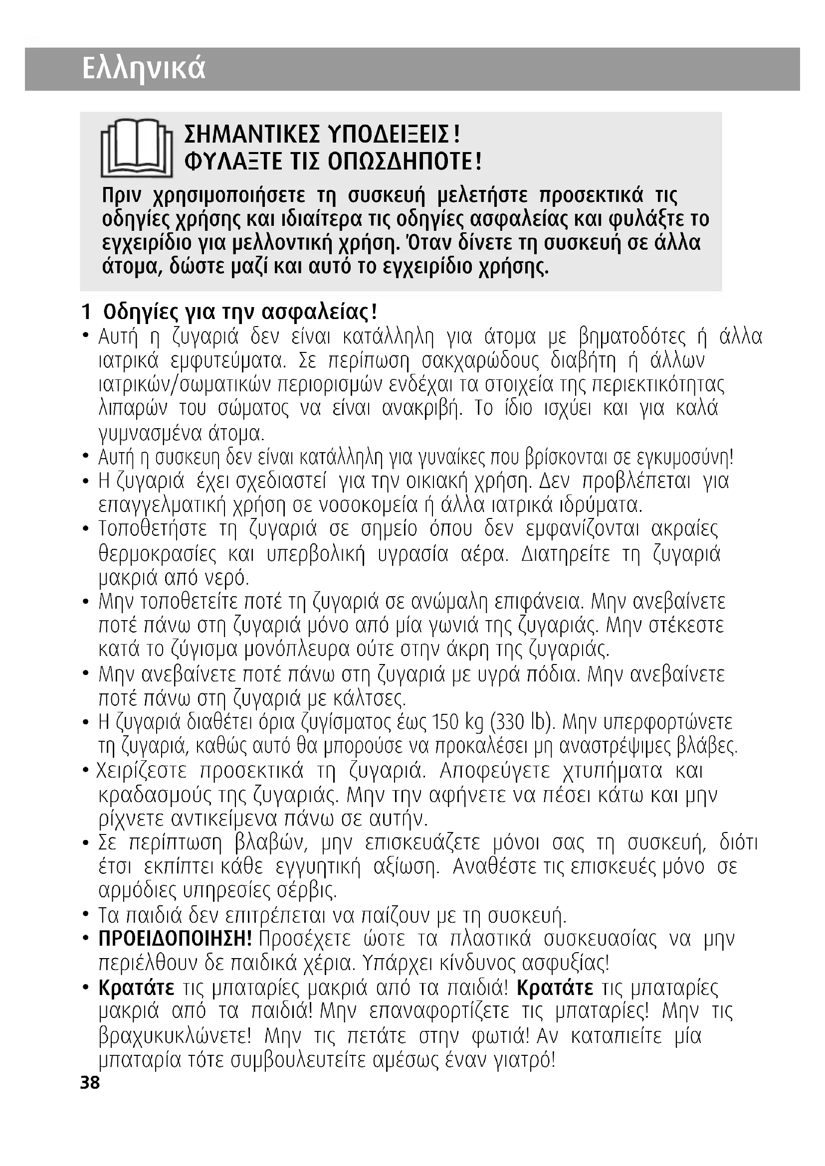 - Η ζυγαριά έχει σχεδιαστεί για την οικιακή χρήση. Δεν προβλέπεται για επαγγελματική χρήση σε νοσοκομεία ή άλλα ιατρικά ιδρύματα.