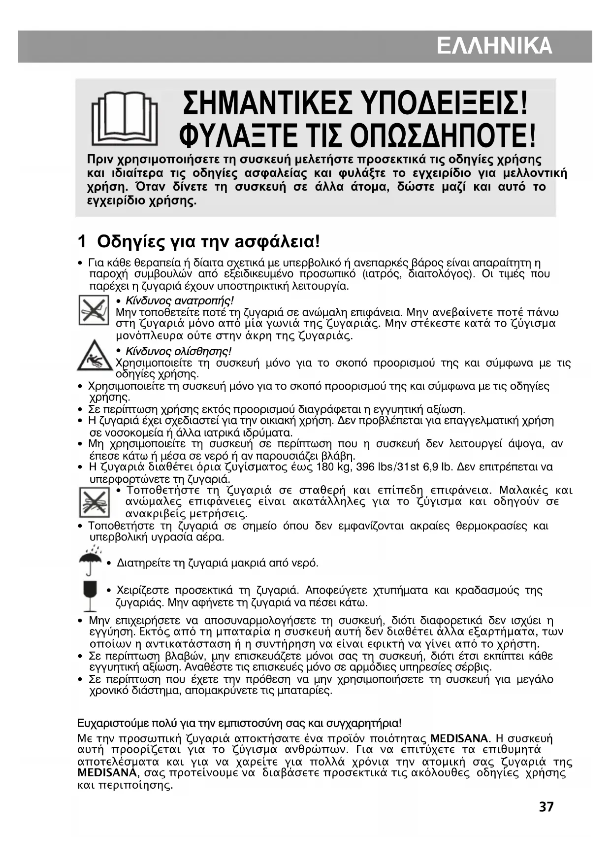 - ™Â ÂÚ›ÙˆÛË Ô˘ ¤¯ÂÙ ÙËÓ ÚfiıÂÛË Ó· ÌËÓ ¯ÚËÛÈÌÔÔÈ‹ÛÂÙ ÙË Û˘Û΢‹ ÁÈ· ÌÂÁ¿ÏÔ ¯ÚÔÓÈÎfi ‰È¿ÛÙËÌ·, ·ÔÌ·ÎÚ‡ÓÂÙ ÙȘ ̷ٷڛ˜.∂˘¯·ÚÈÛÙԇ̠Ôχ ÁÈ· ÙËÓ ÂÌÈÛÙÔÛ‡ÓË Û·˜ Î·È Û˘Á¯·ÚËÙ‹ÚÈ·! Με την προσωπική ζυγαριά αποκτήσατε ένα προϊόν ποιότητας MEDISANA. Η συσκευή αυτή προορίζεται για το ζύγισμα ανθρώπων. Για να επιτύχετε τα επιθυμητάαποτελέσματα και για να χαρείτε για πολλά χρόνια την ατομική σας ζυγαριά τηςMEDISANA, σας προτείνουμε να διαβάσετε προσεκτικά τις ακόλουθες οδηγίες χρήσηςκαι περιποίησης.38 EΛΛHNIK
