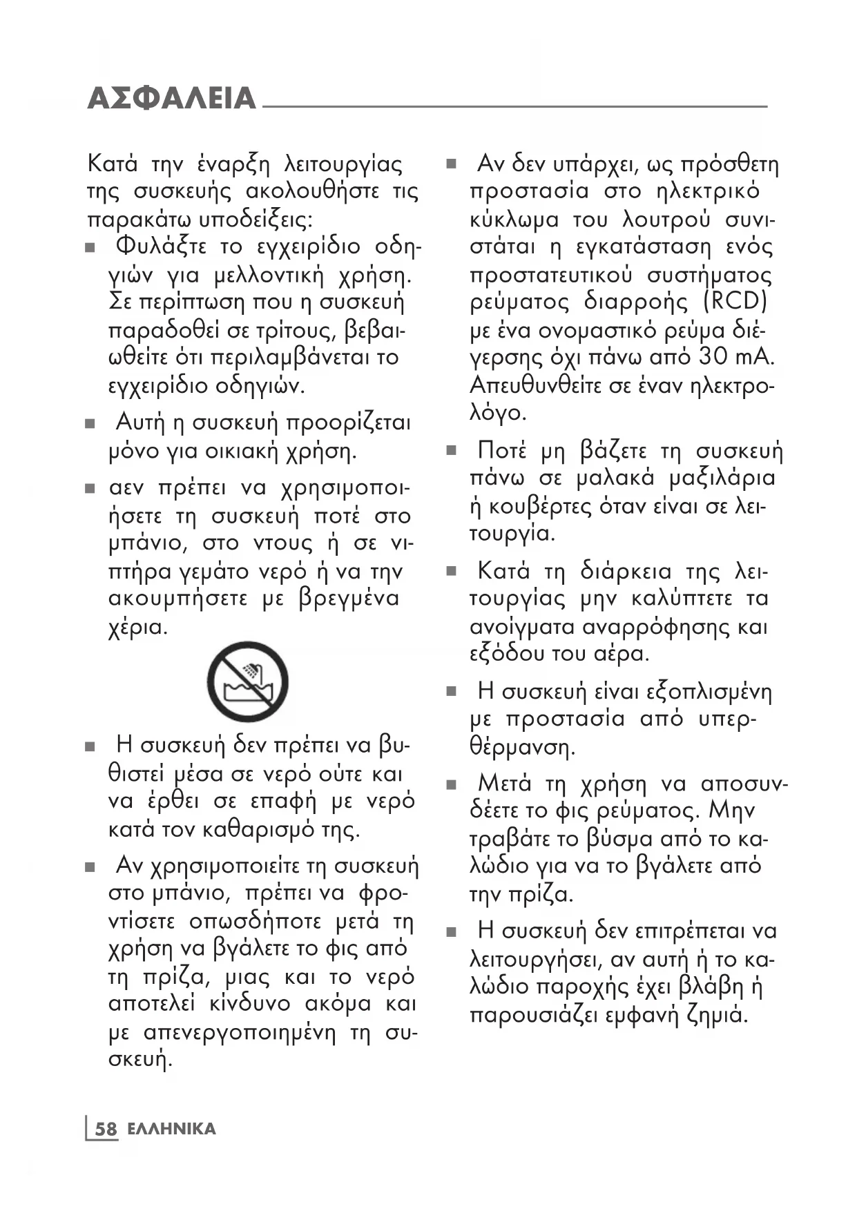 Αν δεν υπάρχει, ως πρόσθετη προστασία στο ηλεκτρικό κύκλωα του λουτρού συνι- στάται η εγκατάσταση ενός προστατευτικού συστήατος ρεύατος διαρροής (RCD) ε ένα ονοαστικό ρεύα διέ- γερσης όχι πάνω από 30 mA. Απευθυνθείτε σε έναν ηλεκτρο-