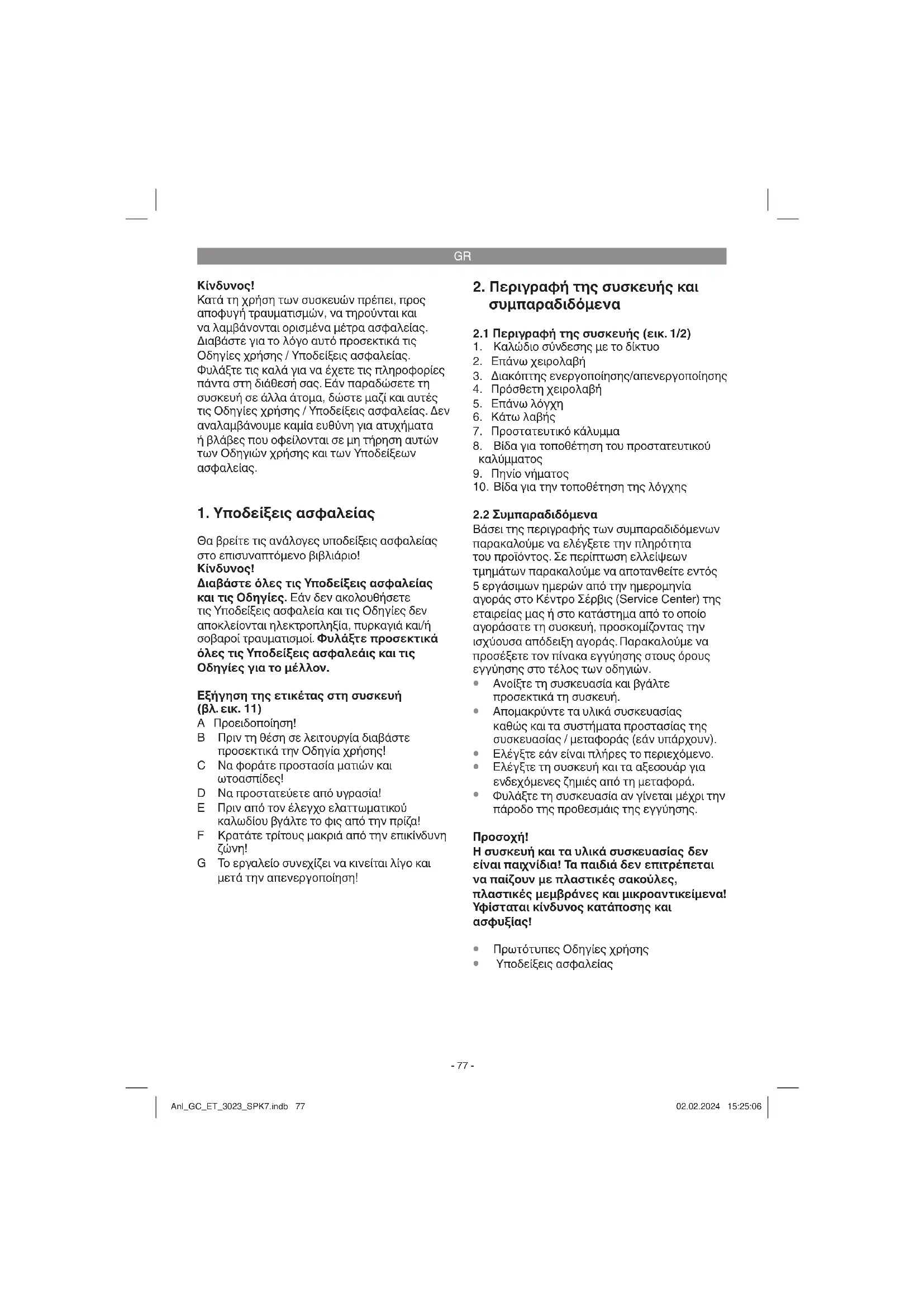 Τα ηλεκτρικά εργαλεία, οι μπαταρίες, τα εξαρτήματα και οι συσκευασίες πρέπει να ανακυκλώνονται με τρόπο φιλικό προς το περιβάλλον. Μην ρίχνετε τα ηλεκτρικά εργαλεία και τις μπαταρίες στα απορρίμματα του σπιτιού σας! Μόνο για χώρες της ΕΕ: Σύμφωνα με την Ευρωπαϊκή οδηγία 2012/19/ΕΕ σχετικά με τις παλιές ηλεκτρικές και ηλεκτρονικές συσκευές και τη μεταφορά της οδηγίας αυτής σε εθνικό δίκαιο τα άχρηστα ηλεκτρικά εργαλεία και σύμφωνα με την Ευρωπαϊκή οδηγία 2006/66/ΕΚ οι χαλασμένες ή χρησιμοποιημένες μπαταρίες πρέπει να συλλέγονται ξεχωριστά, για να ανακυκλωθούν με τρόπο φιλικό προς το περιβάλλον. Σε περίπτωση μη ενδεδειγμένης απόσυρσης οι ηλεκτρικές και ηλεκτρονικές συσκευές λόγω ενδεχομένης παρουσίας επικίνδυνων ουσιών μπορούν να έχουν επιβλαβείς επιπτώσεις στο περιβάλλον και στην ανθρώπινη υγεία. Η ανατύπωση ή οποιασδήποτε άλλης μορφής αναπαραγωγή της τεκμηρίωσης ή άλλων δικαιολογητικών που αναφέρονται στα προϊόντα, ακόμη και αποσπασματικά, επιτρέπεται μόνο με ρητή συγκατάθεση της Einhell Germany AG. M ε επιφύλαξη τεχνικών τροποποιήσεων Anl_GC_ET_3023_SPK7.indb 81Anl_GC_ET_3023_SPK7.indb 81 02.02.2024 15:25:0602.02.2024 15:25:06GR