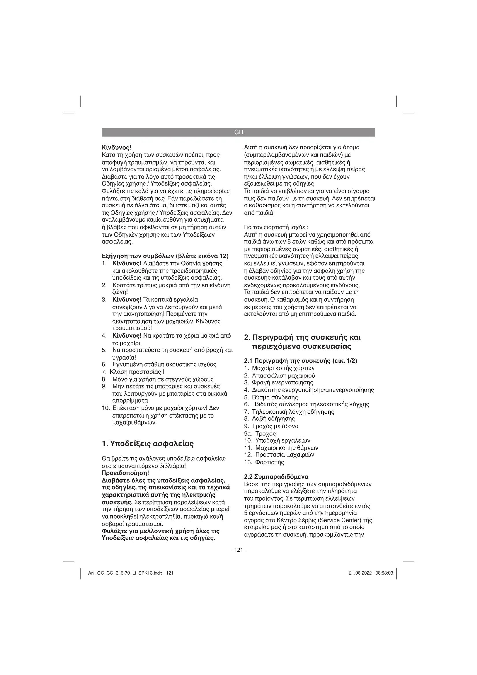 Βάσει της περιγραφής των συμπαραδιδόμενων παρακαλούμε να ελέγξετε την πληρότητα του προϊόντος. Σε περίπτωση ελλείψεων τμημάτων παρακαλούμε να αποτανθείτε εντός 5 εργάσιμων ημερών από την ημερομηνία αγοράς στο Κέντρο Σέρβις (Service Center) της εταιρείας μας ή στο κατάστημα από το οποίο αγοράσατε τη συσκευή, προσκομίζοντας την Anl_GC_CG_3_6-70_Li_SPK13.indb 121Anl_GC_CG_3_6-70_Li_SPK13.indb 121 21.06.2022 08:53:0321.06.2022 08:53:03GR