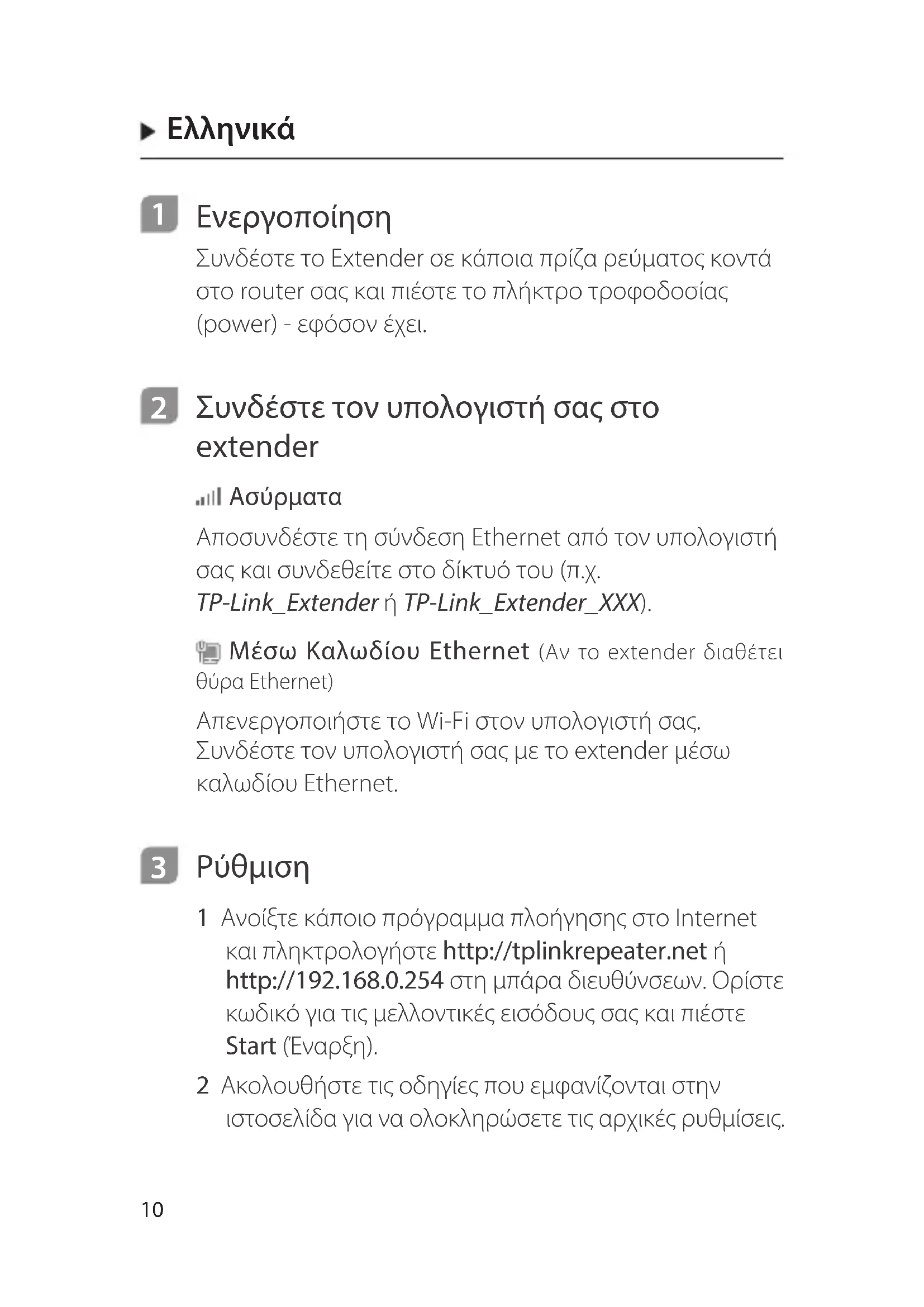 1 Ανοίξτε κάποιο πρόγραμμα πλοήγησης στο Internet και πληκτρολογήστε http://tplinkrepeater.net ή http://192.168.0.254 στη μπάρα διευθύνσεων. Ορίστε κωδικό για τις μελλοντικές εισόδους σας και πιέστε Start (Έναρξη). 2 Ακολουθήστε τις οδηγίες που εμφανίζονται στην ιστοσελίδα για να ολοκληρώσετε τις αρχικές ρυθμίσεις.Ελληνικά