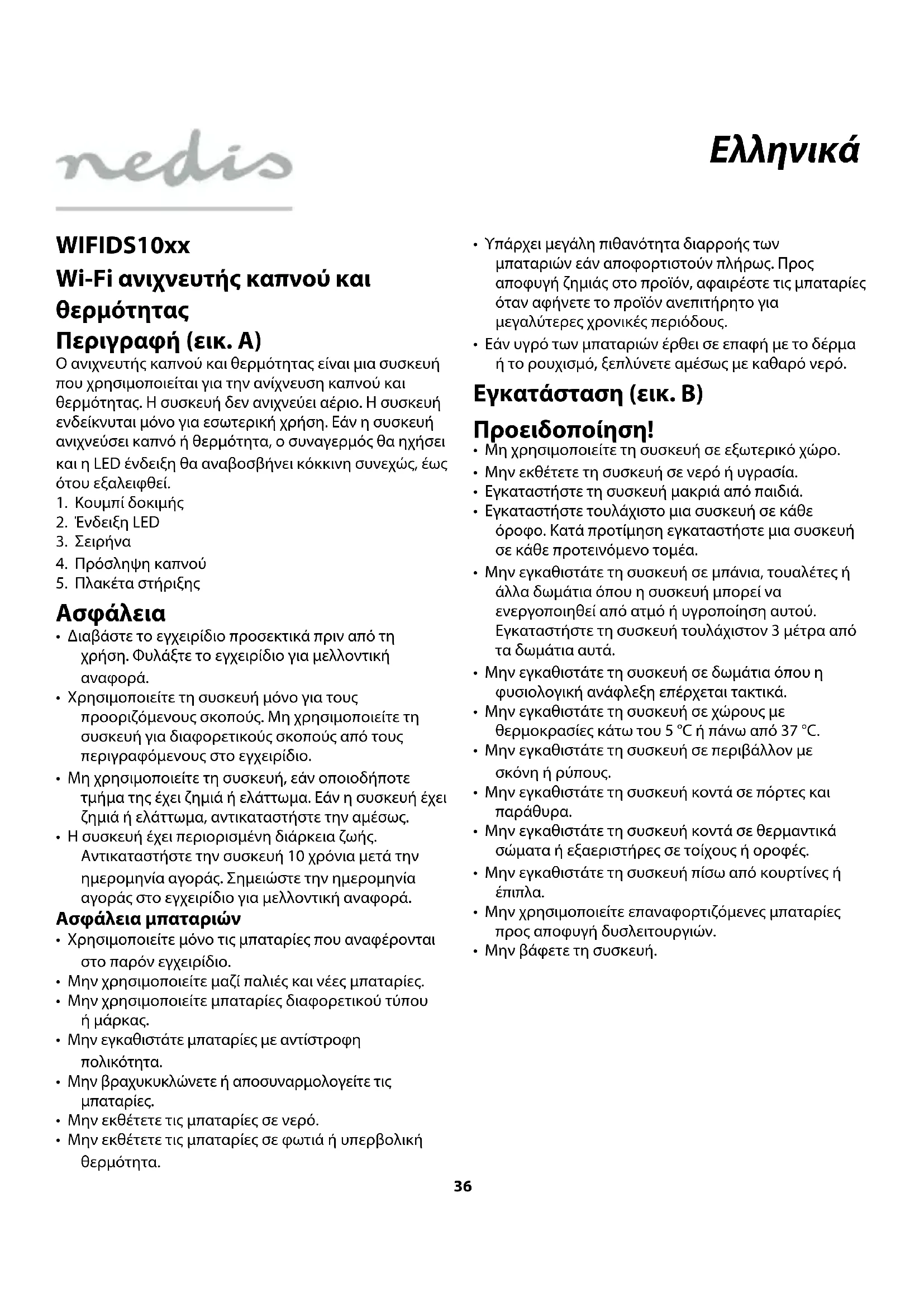 Περιγραφή (εικ. A) Ο ανιχνευτής καπνού και θερμότητας είναι μια συσκευή που χρησιμοποιείται για την ανίχνευση καπνού και θερμότητας. Η συσκευή δεν ανιχνεύει αέριο. Η συσκευή ενδείκνυται μόνο για εσωτερική χρήση. Εάν η συσκευή ανιχνεύσει καπνό ή θερμότητα, ο συναγερμός θα ηχήσει και η LED ένδειξη θα αναβοσβήνει κόκκινη συνεχώς, έως ότου εξαλειφθεί.