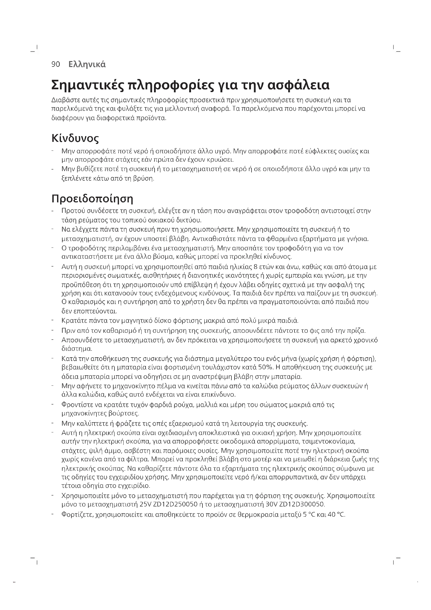 Χρησιμοποιείτε μόνο το μετασχηματιστή που παρέχεται για τη φόρτιση της συσκευής. Χρησιμοποιείτε μόνο το μετασχηματιστή 25V ZD12D250050 ή το μετασχηματιστή 30V ZD12D300050.
