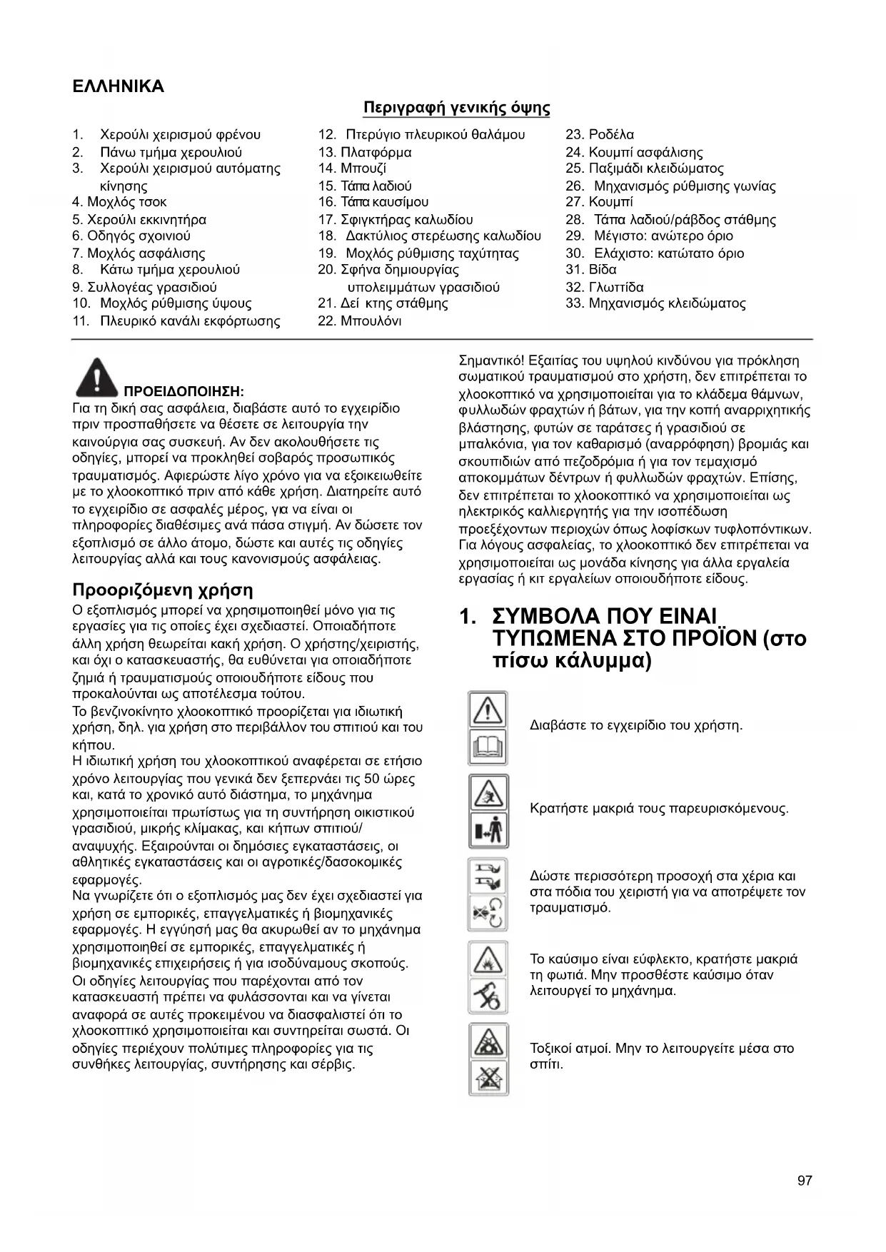 Διαβάστε το εγχειρίδιο του χρήστη. Κρατήστε μακριά τους παρευρισκόμενους. Δώστε περισσότερη προσοχή στα χέρια και στα πόδια του χειριστή για να αποτρέψετε τον τραυματισμό. Το καύσιμο είναι εύφλεκτο, κρατήστε μακριά τη φωτιά. Μην προσθέστε καύσιμο όταν λειτουργεί το μηχάνημα. Τοξικοί ατμοί. Μην το λειτουργείτε μέσα στο σπίτι.98