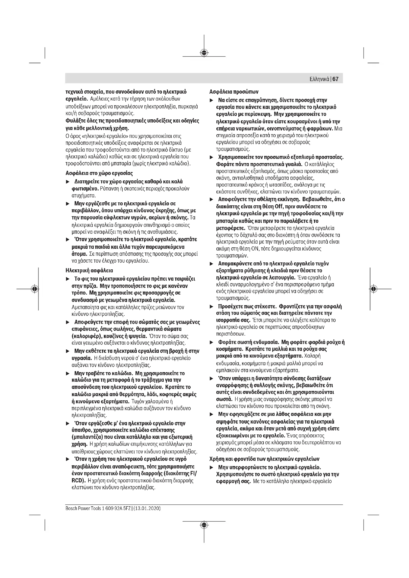 Διαβάστε όλες τις υποδείξεις ασφαλείας, οδηγίες, εικονογραφήσεις και όλα τα 1 609 92A 5FZ | (13.01.2020) Bosch Power ToolsΕλληνικά | 67 τεχνικά στοιχεία, που συνοδεύουν αυτό το ηλεκτρικό εργαλείο. Αμέλειες κατά την τήρηση των ακόλουθων υποδείξεων μπορεί να προκαλέσουν ηλεκτροπληξία, πυρκαγιά και/ή σοβαρούς τραυματισμούς. Φυλάξτε όλες τις προειδοποιητικές υποδείξεις και οδηγίες για κάθε μελλοντική χρήση. Ο όρος «ηλεκτρικό εργαλείο» που χρησιμοποιείται στις προειδοποιητικές υποδείξεις αναφέρεται σε ηλεκτρικά εργαλεία που τροφοδοτούνται από το ηλεκτρικό δίκτυο (με ηλεκτρικό καλώδιο) καθώς και σε ηλεκτρικά εργαλεία που τροφοδοτούνται από μπαταρία (χωρίς ηλεκτρικό καλώδιο). Ασφάλεια στο χώρο εργασίας u Διατηρείτε τον χώρο εργασίας καθαρό και καλά φωτισμένο. Ρύπανση ή σκοτεινές περιοχές προκαλούν