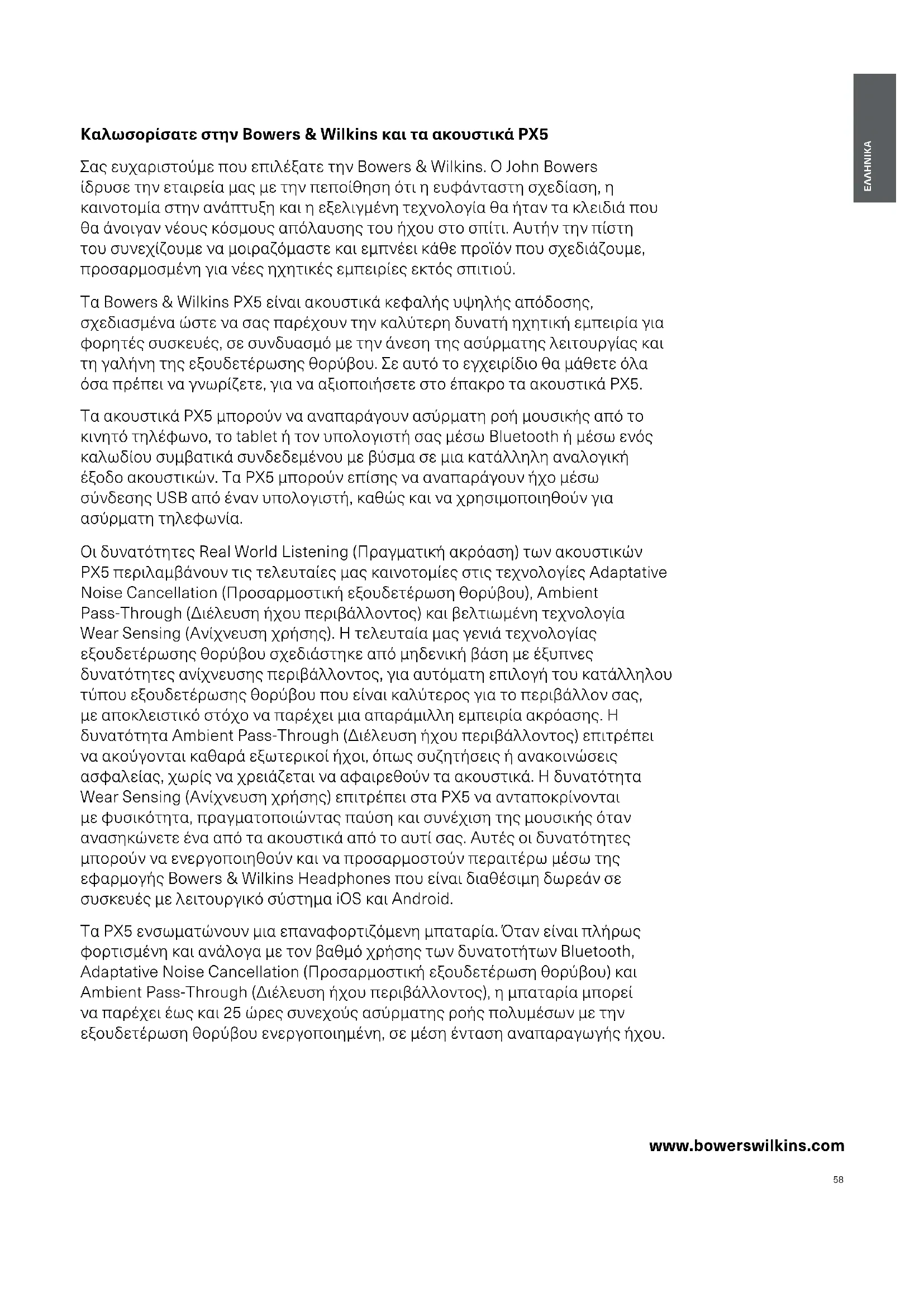 www.bowerswilkins.com Καλωσορίσατε στην Bowers & Wilkins και τα ακουστικά PX5 Σας ευχαριστούμε που επιλέξατε την Bowers & Wilkins. Ο John Bowers ίδρυσε την εταιρεία μας με την πεποίθηση ότι η ευφάνταστη σχεδίαση, η καινοτομία στην ανάπτυξη και η εξελιγμένη τεχνολογία θα ήταν τα κλειδιά που θα άνοιγαν νέους κόσμους απόλαυσης του ήχου στο σπίτι. Αυτήν την πίστη του συνεχίζουμε να μοιραζόμαστε και εμπνέει κάθε προϊόν που σχεδιάζουμε, προσαρμοσμένη για νέες ηχητικές εμπειρίες εκτός σπιτιού. Τα Bowers & Wilkins PX5 είναι ακουστικά κεφαλής υψηλής απόδοσης, σχεδιασμένα ώστε να σας παρέχουν την καλύτερη δυνατή ηχητική εμπειρία για φορητές συσκευές, σε συνδυασμό με την άνεση της ασύρματης λειτουργίας και τη γαλήνη της εξουδετέρωσης θορύβου. Σε αυτό το εγχειρίδιο θα μάθετε όλα όσα πρέπει να γνωρίζετε, για να αξιοποιήσετε στο έπακρο τα ακουστικά PX5. Τα ακουστικά PX5 μπορούν να αναπαράγουν ασύρματη ροή μουσικής από το κινητό τηλέφωνο, το tablet ή τον υπολογιστή σας μέσω Bluetooth ή μέσω ενός καλωδίου συμβατικά συνδεδεμένου με βύσμα σε μια κατάλληλη αναλογική έξοδο ακουστικών. Τα PX5 μπορούν επίσης να αναπαράγουν ήχο μέσω σύνδεσης USB από έναν υπολογιστή, καθώς και να χρησιμοποιηθούν για ασύρματη τηλεφωνία. Οι δυνατότητες Real World Listening (Πραγματική ακρόαση) των ακουστικών PX5 περιλαμβάνουν τις τελευταίες μας καινοτομίες στις τεχνολογίες Adaptative Noise Cancellation (Προσαρμοστική εξουδετέρωση θορύβου), Ambient Pass-Through (Διέλευση ήχου περιβάλλοντος) και βελτιωμένη τεχνολογία Wear Sensing (Ανίχνευση χρήσης). Η τελευταία μας γενιά τεχνολογίας εξουδετέρωσης θορύβου σχεδιάστηκε από μηδενική βάση με έξυπνες δυνατότητες ανίχνευσης περιβάλλοντος, για αυτόματη επιλογή του κατάλληλου τύπου εξουδετέρωσης θορύβου που είναι καλύτερος για το περιβάλλον σας, με αποκλειστικό στόχο να παρέχει μια απαράμιλλη εμπειρία ακρόασης. Η δυνατότητα Ambient Pass-Through (Διέλευση ήχου περιβάλλοντος) επιτρέπει να ακούγονται καθαρά εξωτερικοί ήχοι, όπως συζητήσεις ή ανακοινώσεις ασφαλείας, χωρίς να χρειάζεται να αφαιρεθούν τα ακουστικά. Η δυνατότητα Wear Sensing (Ανίχνευση χρήσης) επιτρέπει στα PX5 να ανταποκρίνονται με φυσικότητα, πραγματοποιώντας παύση και συνέχιση της μουσικής όταν ανασηκώνετε ένα από τα ακουστικά από το αυτί σας. Αυτές οι δυνατότητες μπορούν να ενεργοποιηθούν και να προσαρμοστούν περαιτέρω μέσω της εφαρμογής Bowers & Wilkins Headphones που είναι διαθέσιμη δωρεάν σε συσκευές με λειτουργικό σύστημα iOS και Android. Τα PX5 ενσωματώνουν μια επαναφορτιζόμενη μπαταρία. Όταν είναι πλήρως φορτισμένη και ανάλογα με τον βαθμό χρήσης των δυνατοτήτων Bluetooth, Adaptative Noise Cancellation (Προσαρμοστική εξουδετέρωση θορύβου) και Ambient Pass-Through (Διέλευση ήχου περιβάλλοντος), η μπαταρία μπορεί να παρέχει έως και 25 ώρες συνεχούς ασύρματης ροής πολυμέσων με την εξουδετέρωση θορύβου ενεργοποιημένη, σε μέση ένταση αναπαραγωγής ήχου.