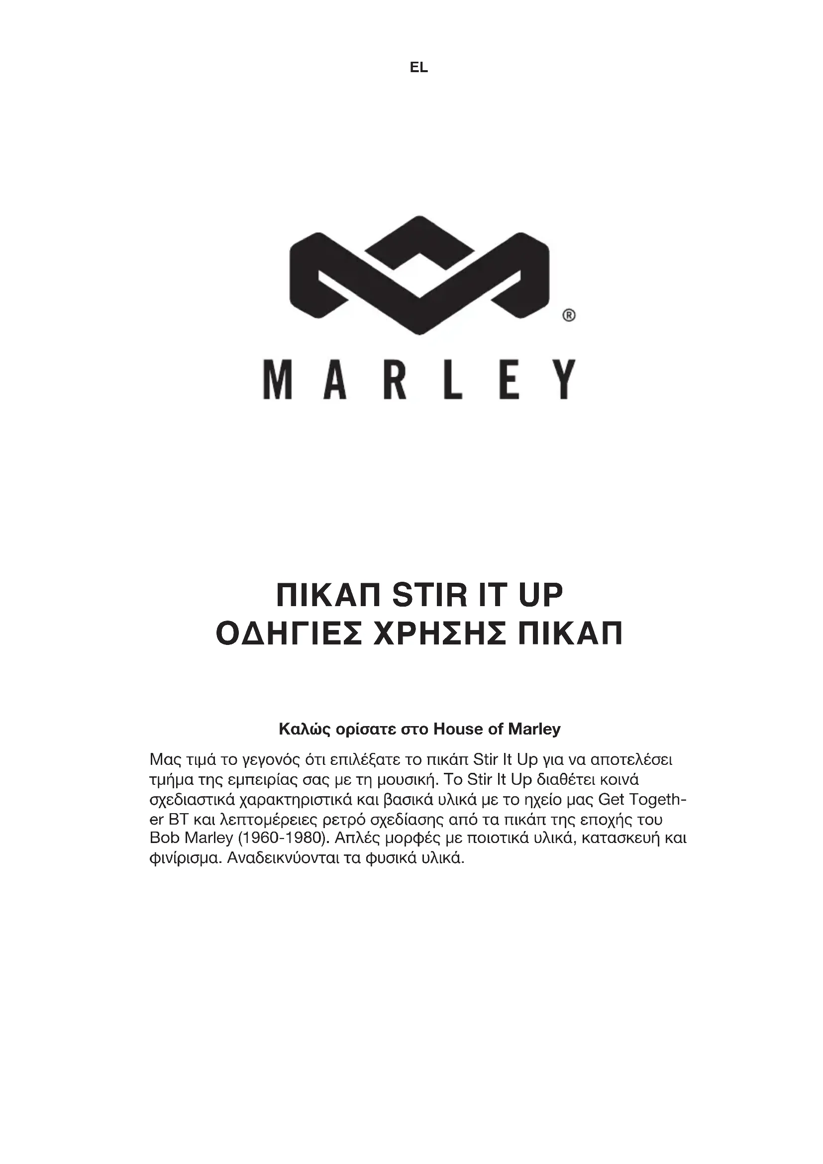 ΟΔΗΓΙΕΣ ΧΡΗΣΗΣ ΠΙΚΆΠ Καλώς ορίσατε στο House of Marley Μας τιμά το γεγονός ότι επιλέξατε το πικάπ Stir It Up για να αποτελέσει τμήμα της εμπειρίας σας με τη μουσική. Το Stir It Up διαθέτει κοινά σχεδιαστικά χαρακτηριστικά και βασικά υλικά με το ηχείο μας Get Togeth- er BT και λεπτομέρειες ρετρό σχεδίασης από τα πικάπ της εποχής του Bob Marley (1960-1980). Απλές μορφές με ποιοτικά υλικά, κατασκευή και φινίρισμα. Αναδεικνύονται τα φυσικά υλικά. ELEL ΠΡΙΝ ΤΗ ΧΡΗΣΗ