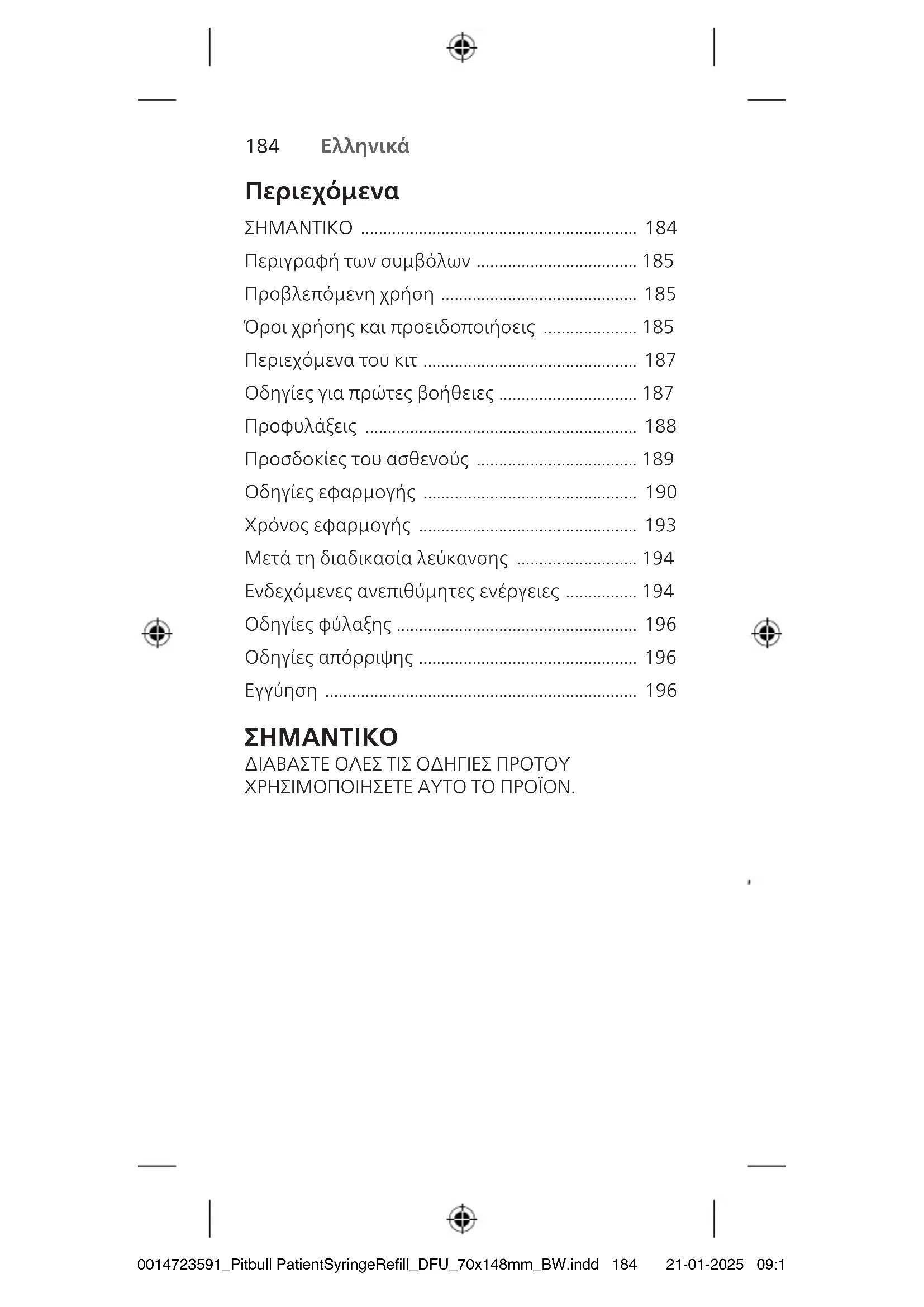 - Κρατήστε το μακριά από το άμεσο ηλιακό φως και από πηγές θερμότητας Θερμοκρασία αποθήκευσης Περίοδος διατηρησιμότητας μετά το άνοιγμα Χρήση κατά προτίμηση πριν από την ημερομηνία λήξης Προβλεπόμενη χρήση Philips Zoom! Τα τζελ λεύκανσης δοντιών DayWhite/NiteWhite είναι προϊόντα για χρήση από τον καταναλωτή (στο σπίτι) για τη λεύκανση αποχρωματισμένων φυσικών δοντιών. Όροι χρήσης και προειδοποιήσεις - Αυτό το προϊόν δεν προορίζεται για χρήση σε ασθενείς με προβλήματα στοματικής υγείας ή υποκείμενα νοσήματα. Πριν από οποιαδήποτε θεραπεία λεύκανσης, συνιστάται η συμβουλή εξειδικευμένου οδοντιάτρου για να διασφαλιστεί ότι δεν υπάρχουν προβλήματα στοματικής υγείας ή υποκείμενα νοσήματα, δεν υπάρχει τερηδόνα και όλες 300014723591_Pitbull PatientSyringeRefill_DFU_70x148mm_BW.indd 184300014723591_Pitbull PatientSyringeRefill_DFU_70x148mm_BW.indd 184 21-01-2025 09:1121-01-2025 09:11Ελληνικά 185 184 Ελληνικά Περιεχόμενα ΣΗΜΑΝΤΙΚΟ p. 184