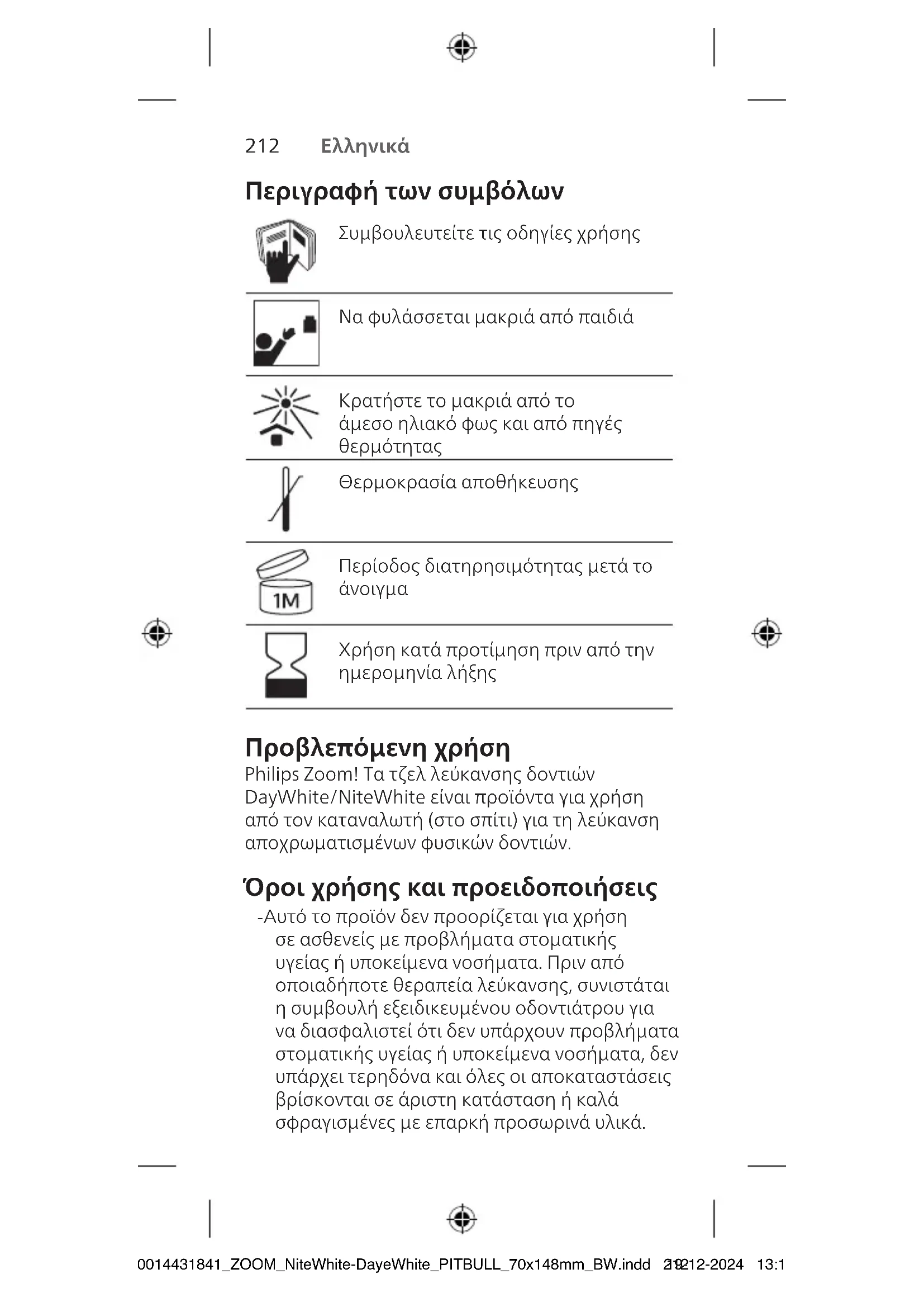ΔΙΑΒΑΣΤΕ ΟΛΕΣ ΤΙΣ ΟΔΗΓΙΕΣ ΠΡΟΤΟΥ ΧΡΗΣΙΜΟΠΟΙΗΣΕΤΕ ΑΥΤΟ ΤΟ ΠΡΟΪΟΝ. 300014431841_ZOOM_NiteWhite-DayeWhite_PITBULL_70x148mm_BW.indd 211300014431841_ZOOM_NiteWhite-DayeWhite_PITBULL_70x148mm_BW.indd 21119-12-2024 13:1219-12-2024 13:12Ελληνικά 213 212 Ελληνικά Περιγραφή των συμβόλων Συμβουλευτείτε τις οδηγίες χρήσης Να φυλάσσεται μακριά από παιδιά Κρατήστε το μακριά από το άμεσο ηλιακό φως και από πηγές